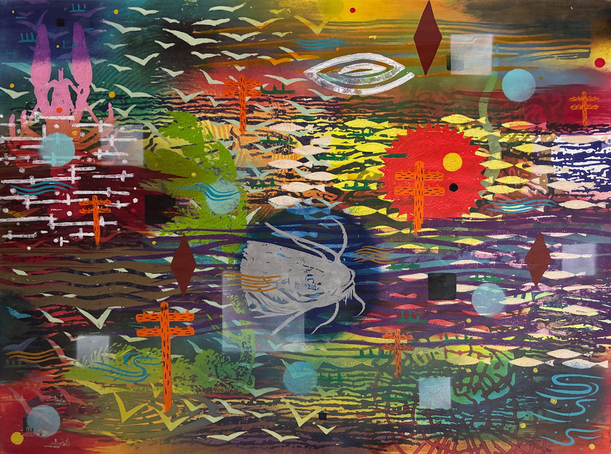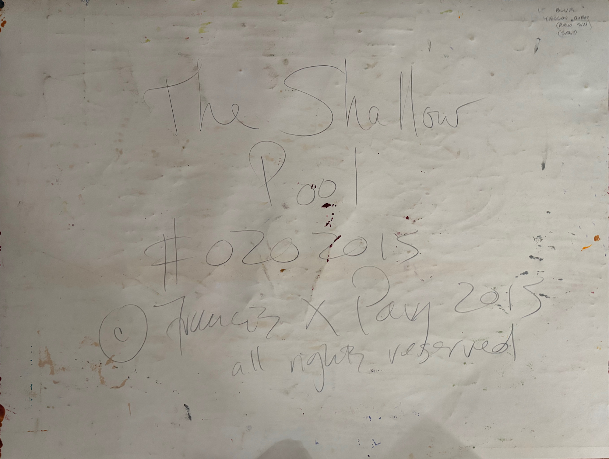 This piece is in excellent condition and has never been exhibited before. It was created by repeatedly layering relief prints, resulting in a rich, textured surface. The pressure applied during printing has left an embossed impression and traces of ink on the reverse side. In the Upper Right corner of the reverse, "Lt blue,Yellow over (red sun) (sand) " are handwritten in pencil—notes made by Pavy during the printing process. This is a one-of-a-kind piece, signed on the reverse with Pavy’s inventory number #0202015