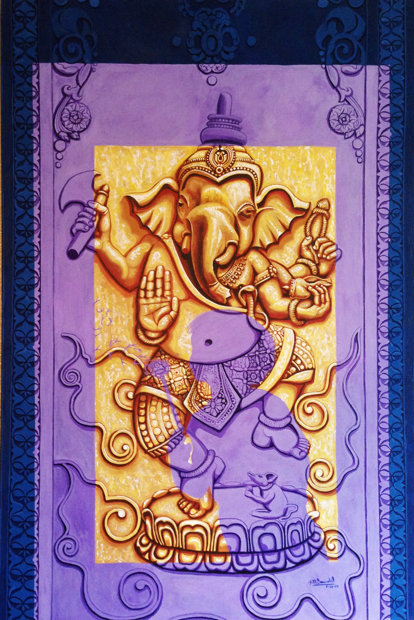 The shadow of a kid blowing a daisy is cast in front of a temple dedicated to Ganesha. This interplay of innocence and spirituality highlights the connection between youthful wonder and divine presence, capturing a moment of serene beauty and reflection.