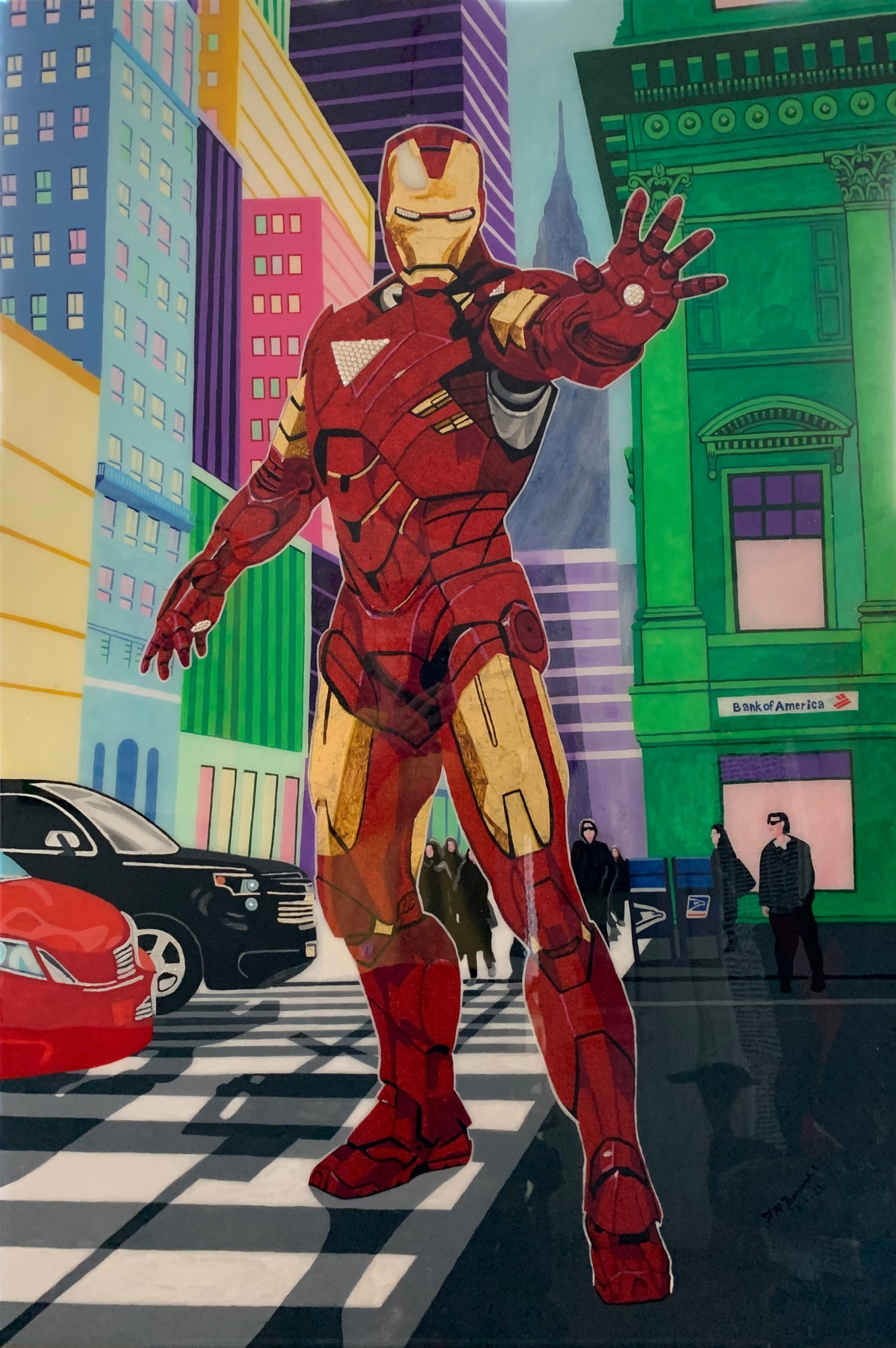 This dynamic commission piece is the artistic version of one of Iron Mann and glitter, topped with Swarovski crystals- an effect that mimics the sun shining on his uniform. His image is framed by a typical rooftop landing zone, a New York background that gives a feel of reality and enhances the 3D depth of this mixed-media artwork.