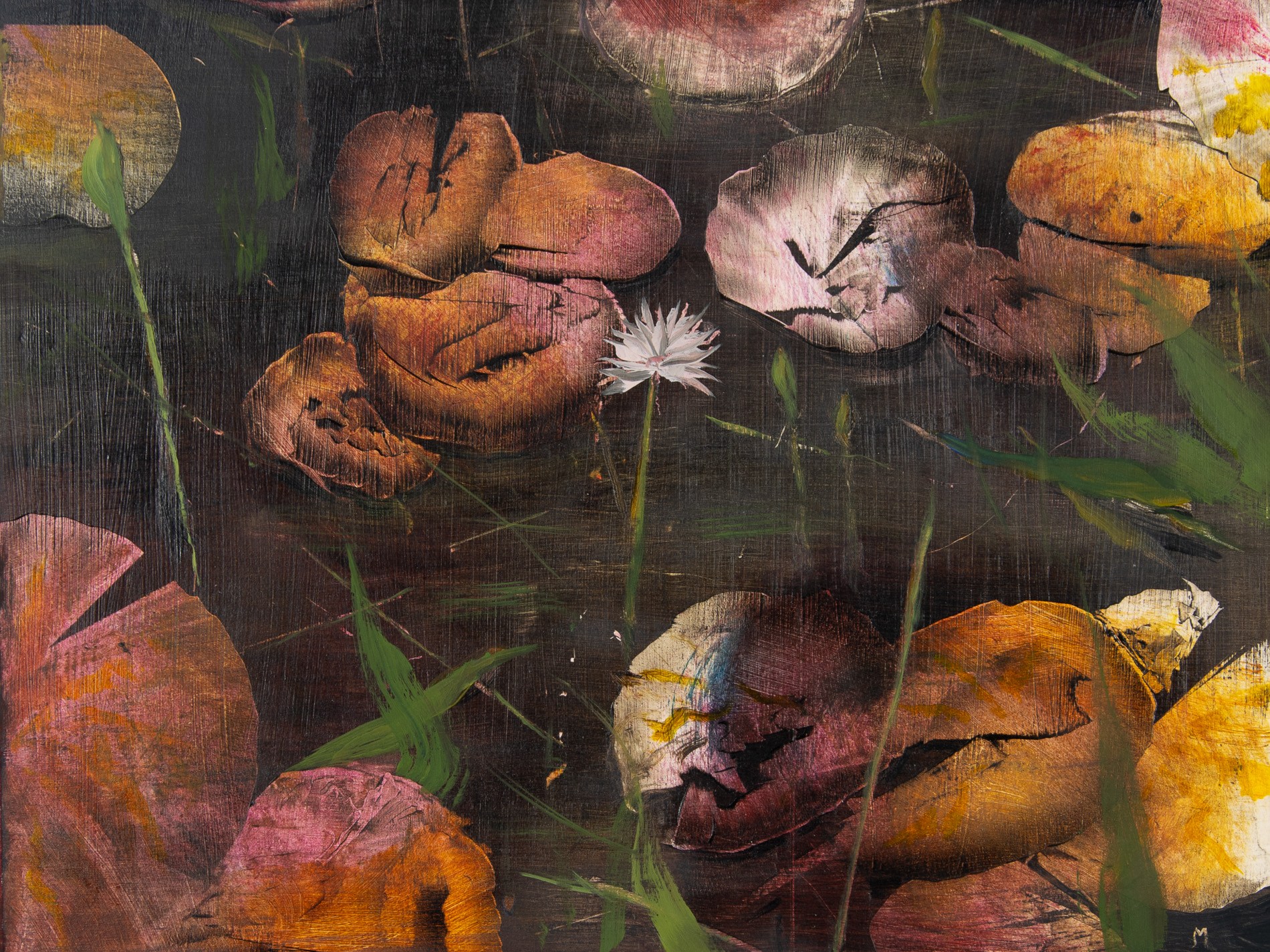 This abstracted oil of an imaginary lily pond was done as an an exercise in using a squeegee to create the shapes of the lilies, A multi-colored base was laid down and after this dried a dark layer of paint over the entire surface was applied and then strategically removed with the squeegee to create the abstract appearance of the lilies. Almost a magic trick.