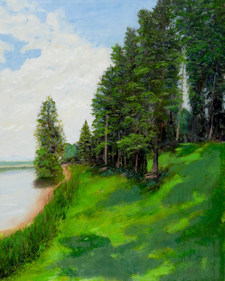 I first painted this Grove of trees at the edge of Loch Raven onsite "en Plein Air" This studio piece is a reworking of the scene to include more of the waters edge. I love this grove of trees and will probably return to paint it onsite again soon.