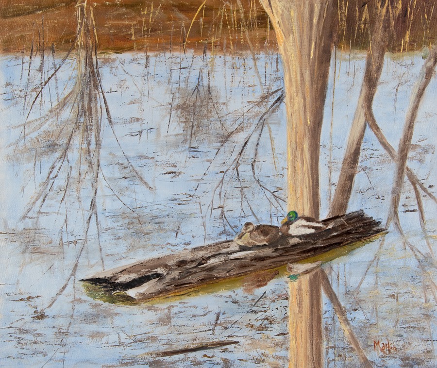 The Promenade along the Havre de Grace waterfront is a wonderful place to take a walk, with lots to see. Near one end of the Promenade a tidal pond nips into a cove and creates an inviting habitat for geese and ducks. On this spring day I spied two ducks napping on a log and knew that I had to paint them. This scene features the ducks and the reflections of the trees and bracken on far bank.