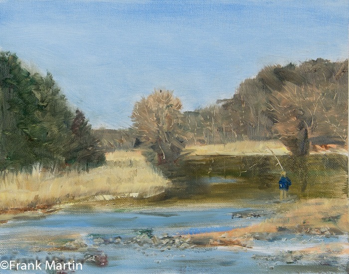 Loch Raven Reservoir has a number of very scenic sites. This one is at just below the outflow from the dam flowing into the Big Gunpowder Falls. The fly fisherman here captured my attention on a crisp fall day. This painting is a quick study I did as an experiment and is my first with Cobra Water Mixable oils. Cobra are rapidly gaining popularity with Plein Painters as it eliminates the need to travel with solvents and deal with TSA restrictions and disposal issues. Simply thin and cleanup with water.