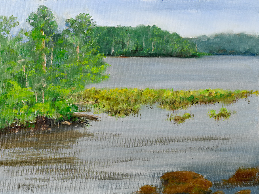 On a recent trip down through Maryland’s Eastern Shore, one of our stops was Shad Landing in the Pocomoke River State Park. I was attracted by the layers of depth in this scene and by the Lily Pads extending out into the river halfway across. It was a hot July weekend so I broke out my Plein Air kit and setup in the shade of tree on the bank to do this piece