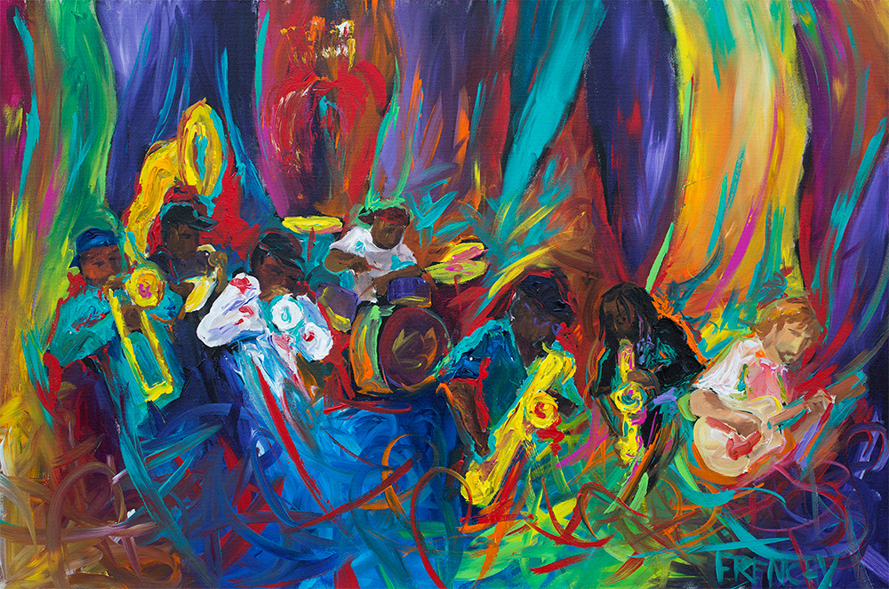 This painting of the Dirty Dozen Brass Band was produced live at the House of Blue in Orlando, Florida.
