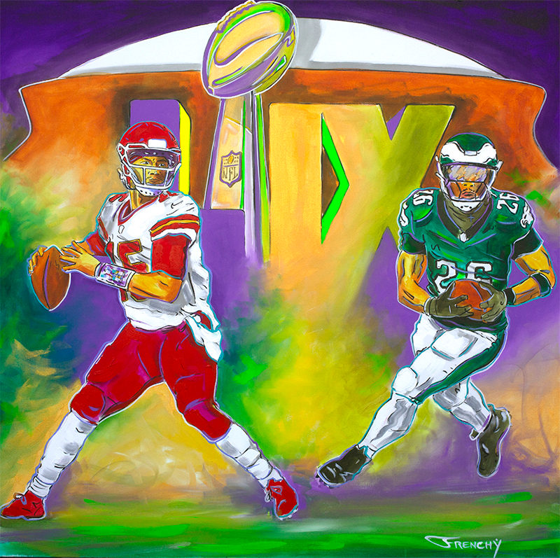 Painted live by Frenchy at the 2025 Cigar with the Stars event in New Orleans, this Super Bowl LIX piece features Patrick Mahomes and Saquon Barkley. Created in collaboration with the Ditka & Jawz Foundation, continuing a trusted partnership.