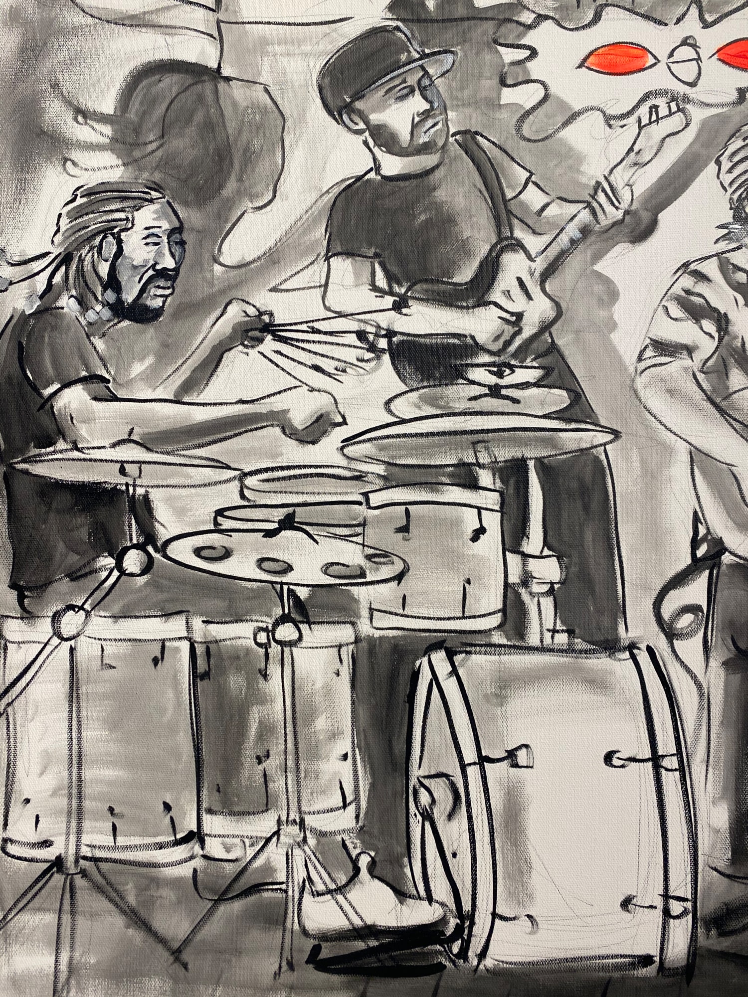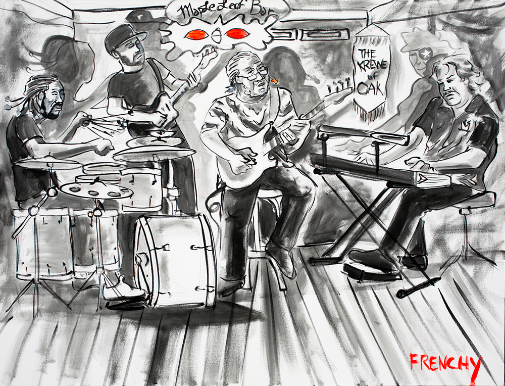 This painting of George Porter Jr. trio was produced on June 28th, 2022 in New Orleans, LA at the Maple Lear Bar located Uptown.
