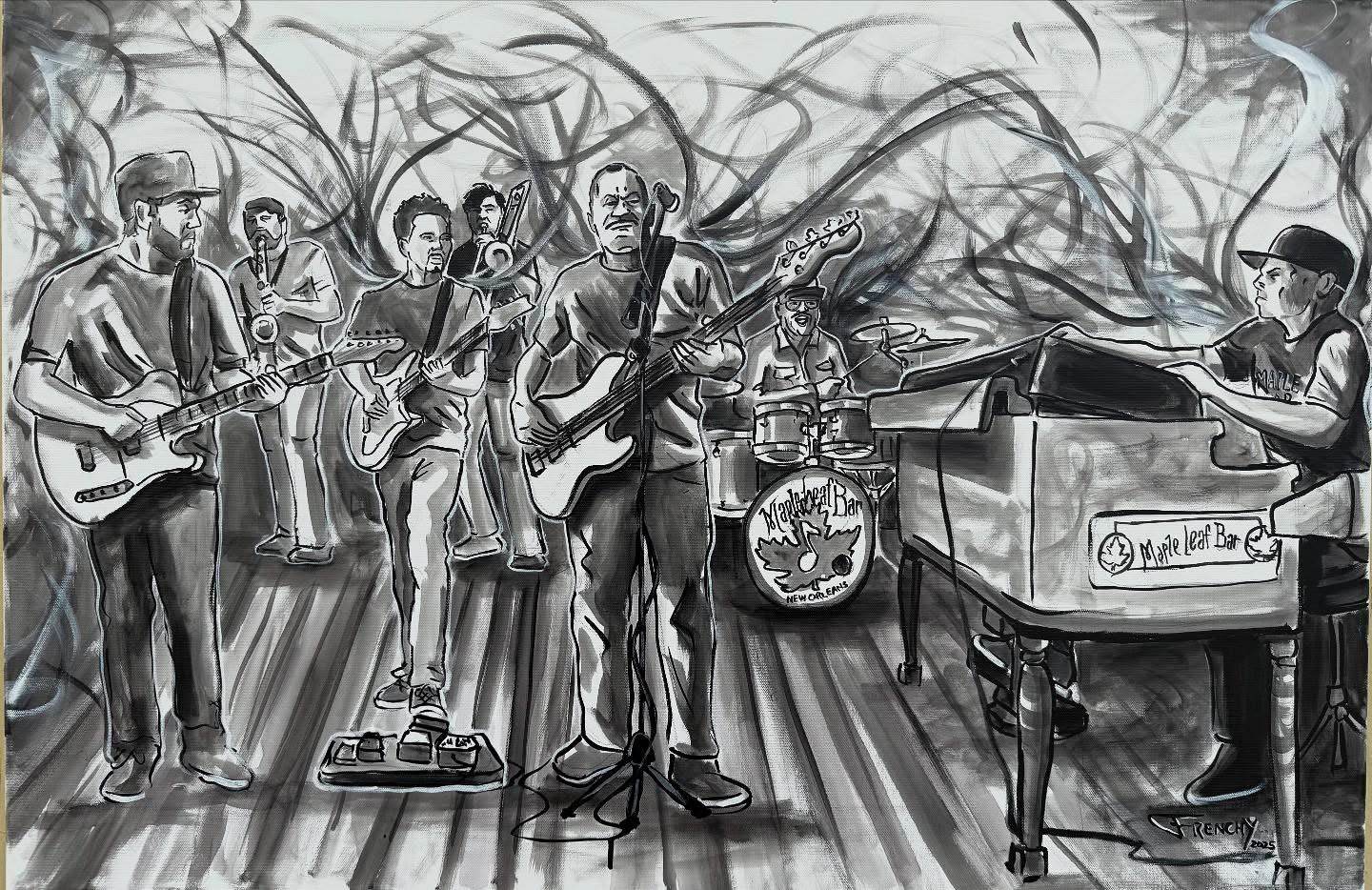 Painted live by Frenchy in bold black & white style, this piece features Ivan Neville, Ian Neville, Tony Hall, Raymond Webber, Ari Teitel, Brad Walker, and Alex Wasily. Captured during a powerful night at the Maple Leaf Bar.