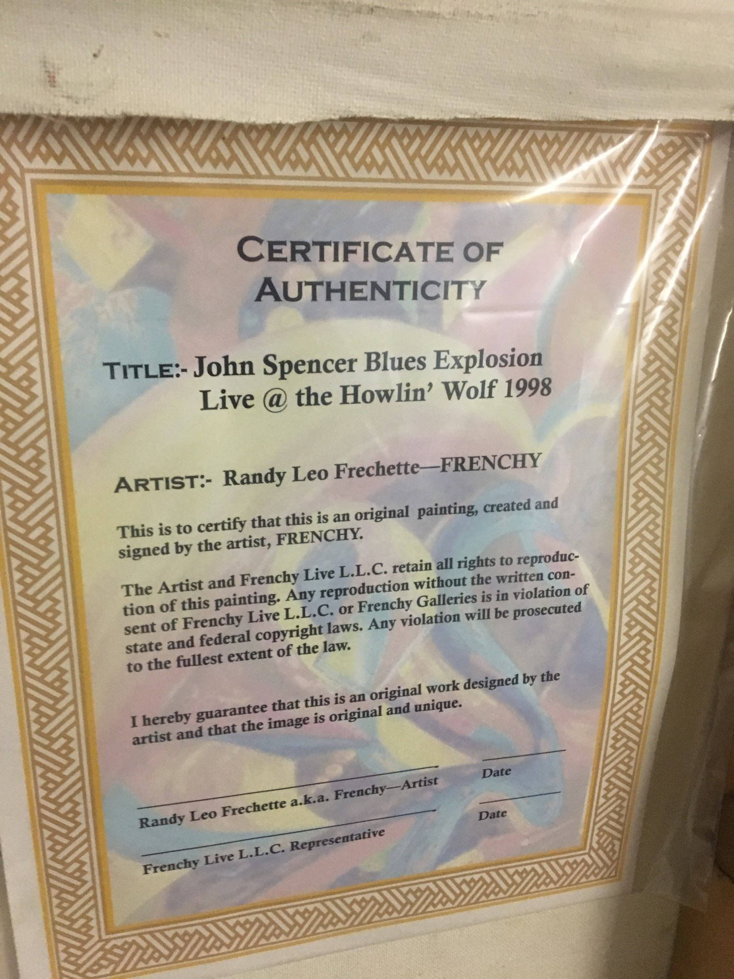 This painting of the John Spencer Blues Explosion was painting live at the Howlin Wolf in New Orleans in 1998.