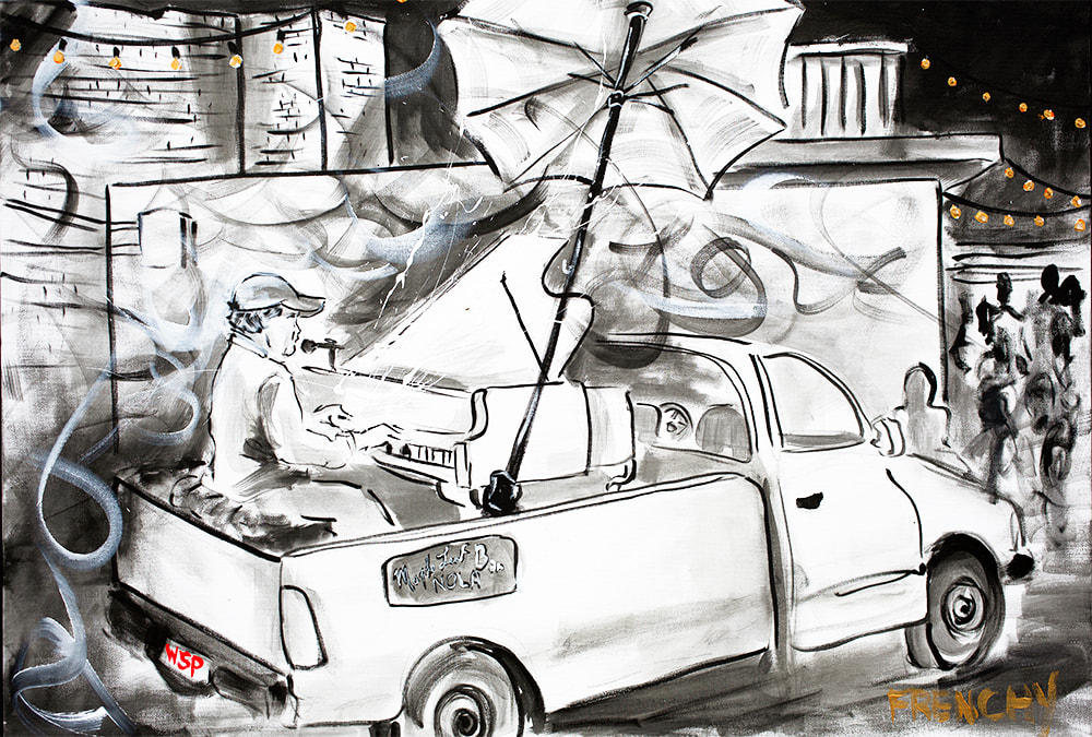 This painting of JoJo Herman from Widespread Panic was produced live at Zoney Mash in New Orleans, Louisiana. This painting was painting #2 two pieces painted that evening.