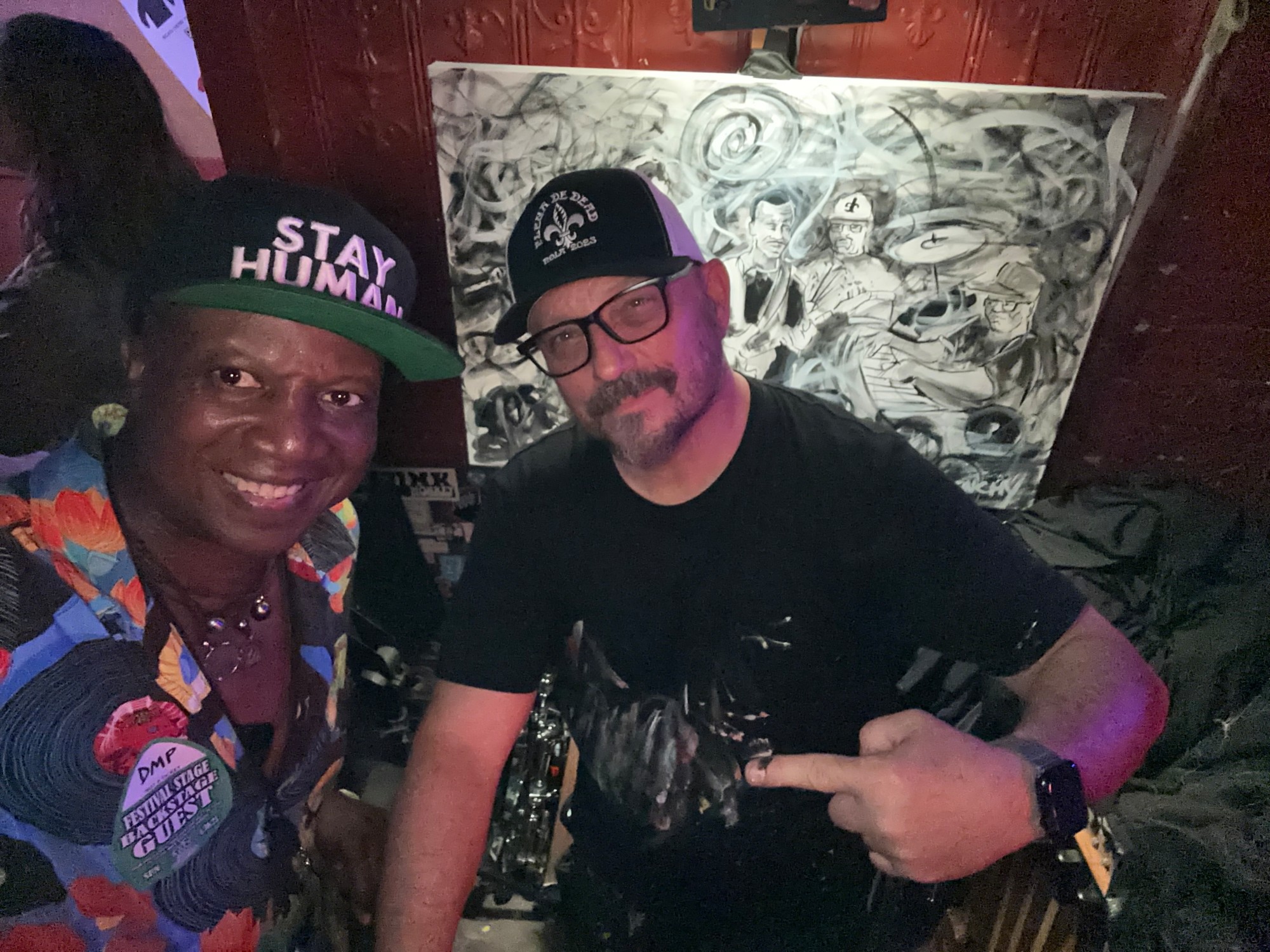 This black and white painting captures the electrifying energy of the Maple Leaf All Stars performance during Festing @ The Leaf, the late night music series hosted by the famous Maple Leaf Bar. Created on April 30th, the painting features a dynamic composition that highlights the movement and passion of the musicians on stage. At the center of the painting stands Karl Denson, a renowned saxophonist and flutist, whose soulful melodies seem to infuse the air with a sense of joy and energy. Flanking him on either side are Tony Hall and Ivan Neville, both acclaimed musicians in their own right, who add layers of depth and complexity to the music with their bass and keyboard skills. Behind them, Raymond Weber, the drummer, and Ari Teitel, the guitarist, can be seen in action, adding rhythm and texture to the music.