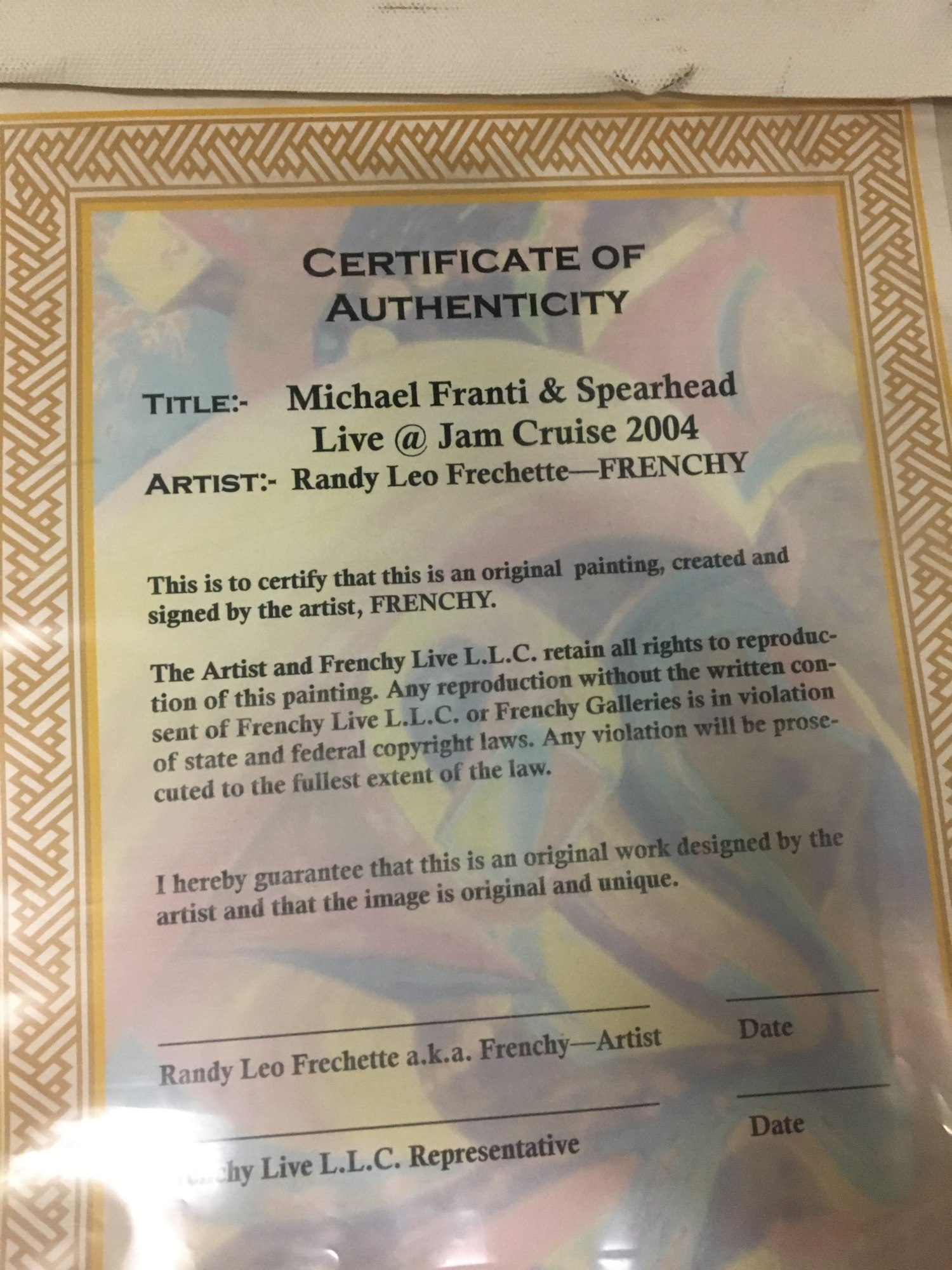 This painting of Michael Franti and Spearheaded was produced live in 2004 on Jam Cruise.