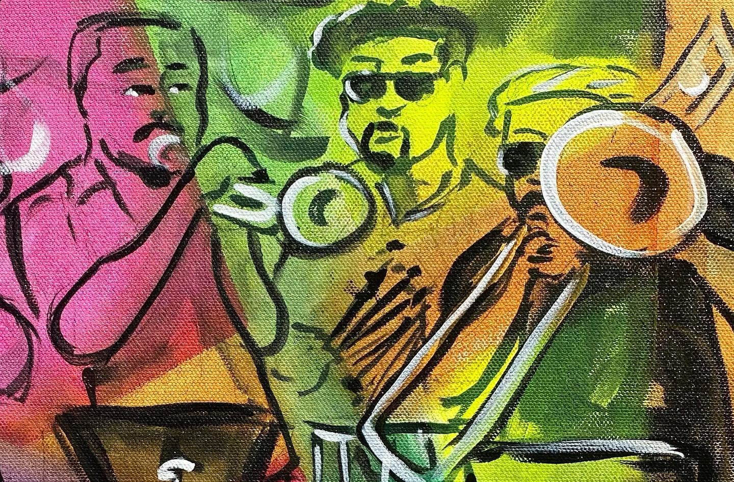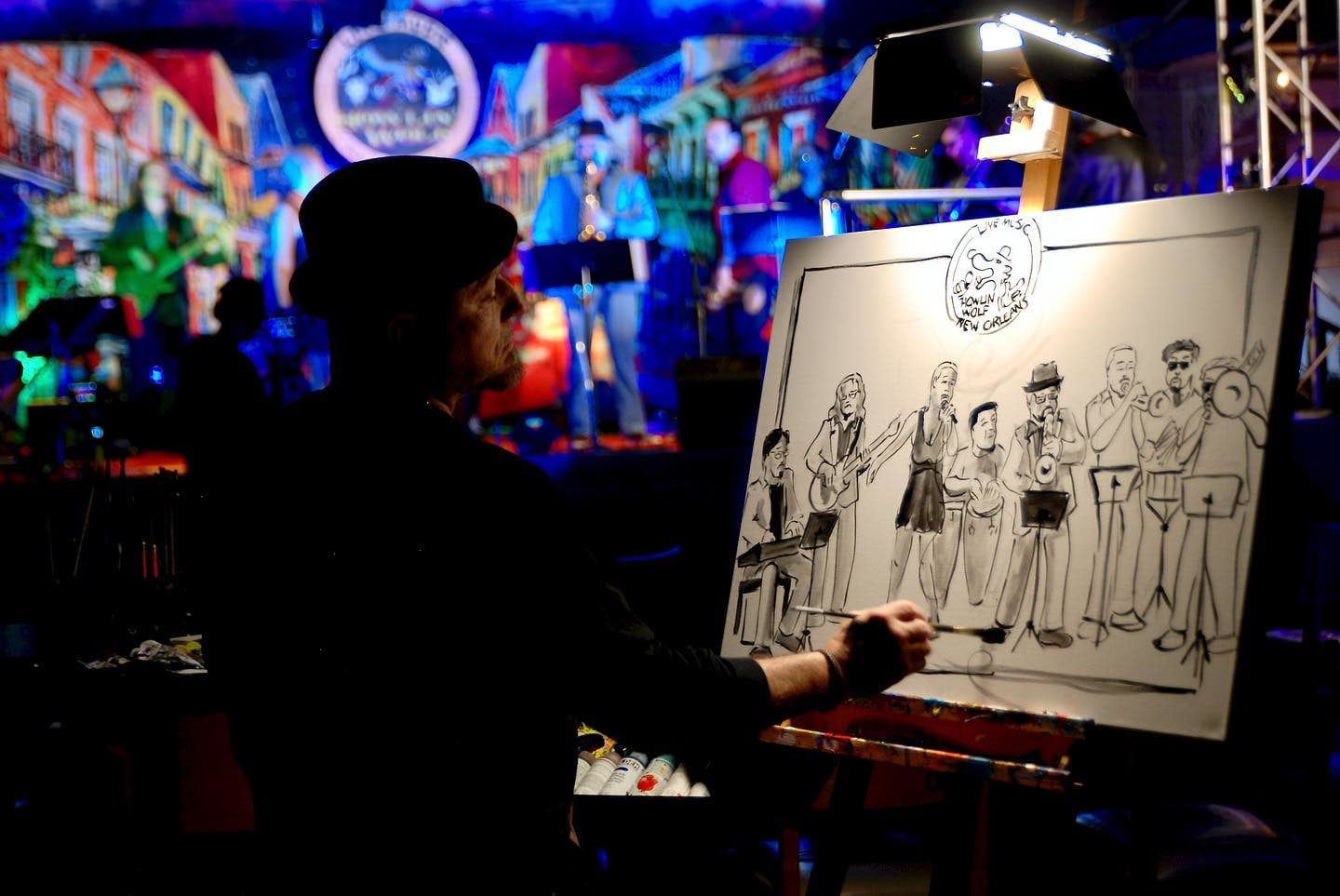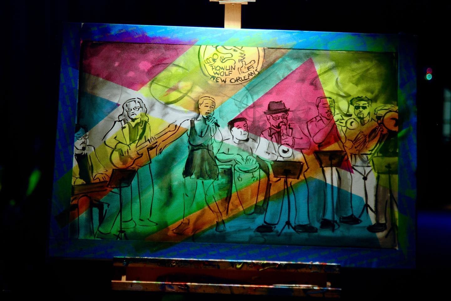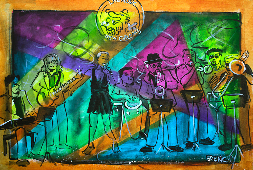This painting of Muévelo featuring: Margie Perez & Brent Rose was painted live by Frenchy at the Howlin' Wolf in New Orleans as part of the Funky Uncle Live series.