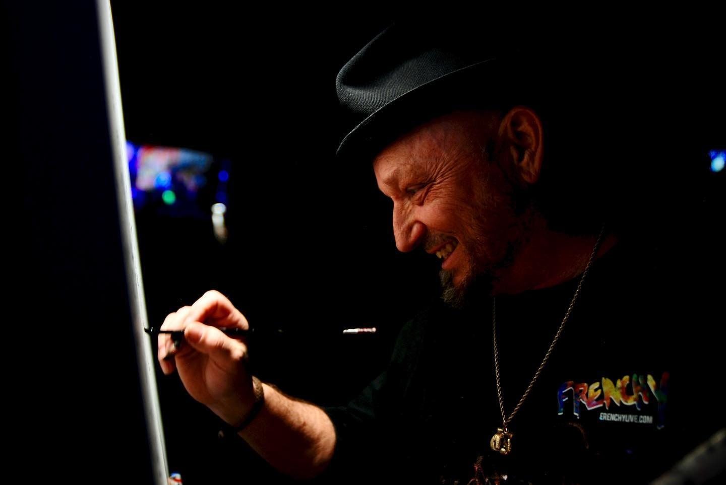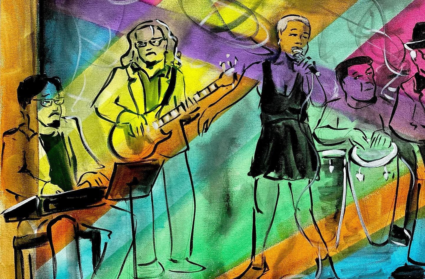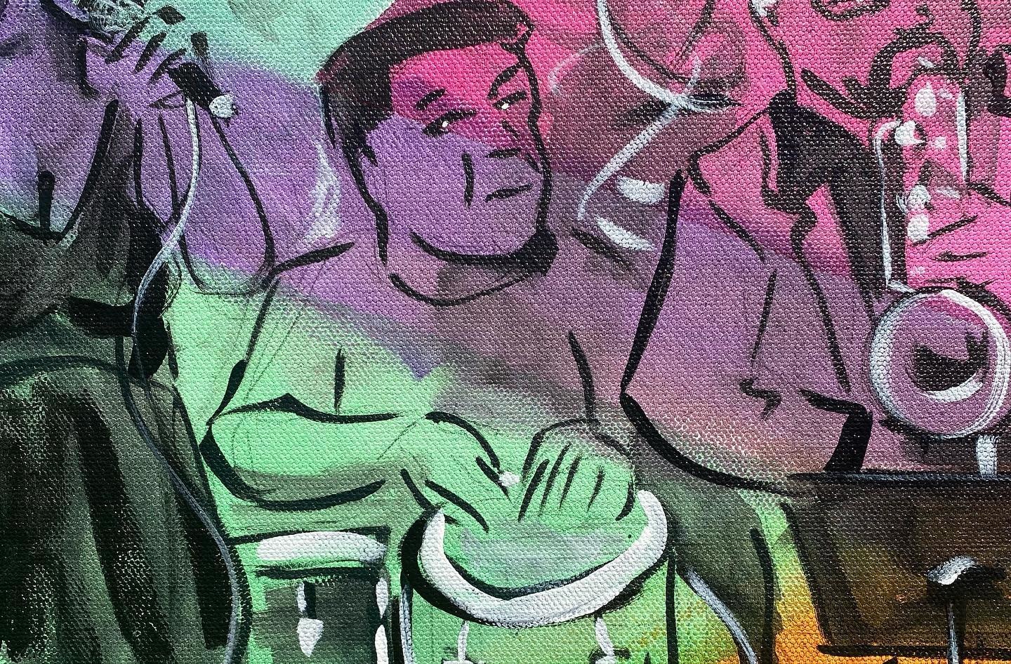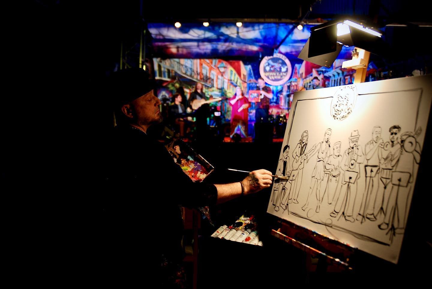 This painting of Muévelo featuring: Margie Perez & Brent Rose was painted live by Frenchy at the Howlin' Wolf in New Orleans as part of the Funky Uncle Live series.
