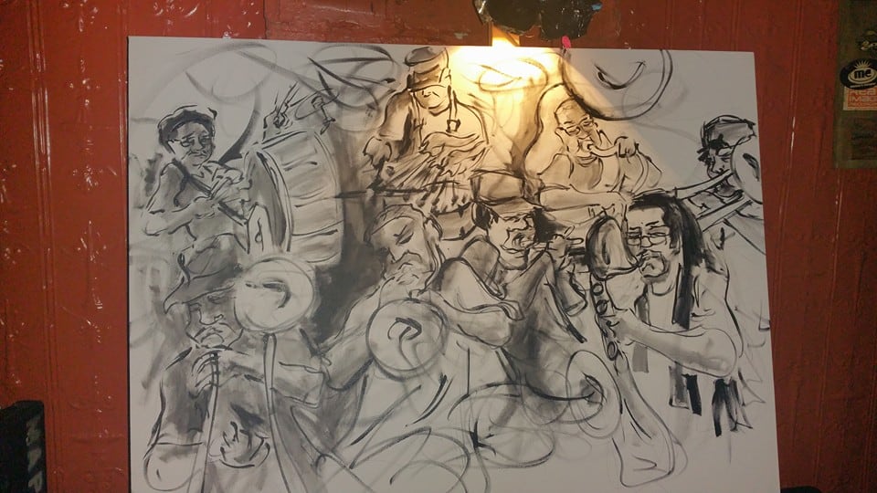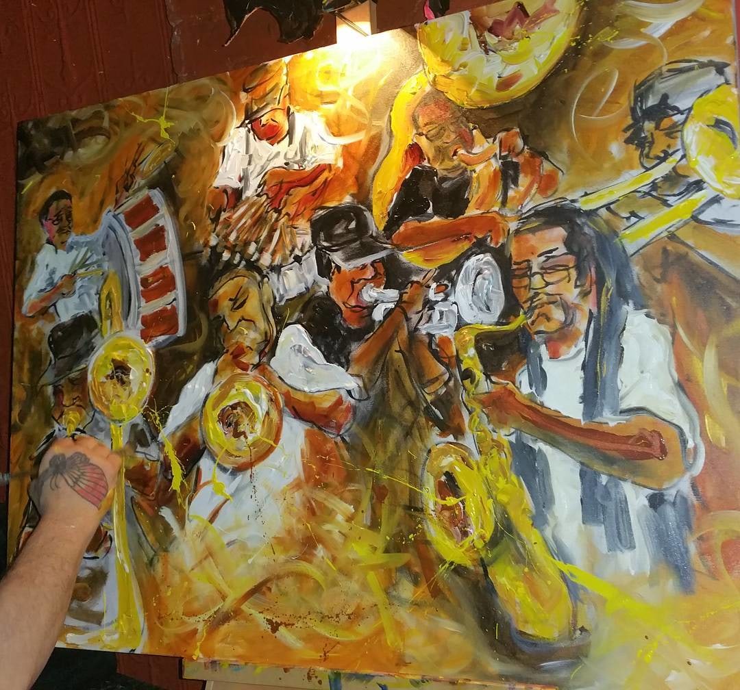 This painting of Rebirth Brass Band was produced live at the Maple Leaf Bar on March 1st of 2016.
