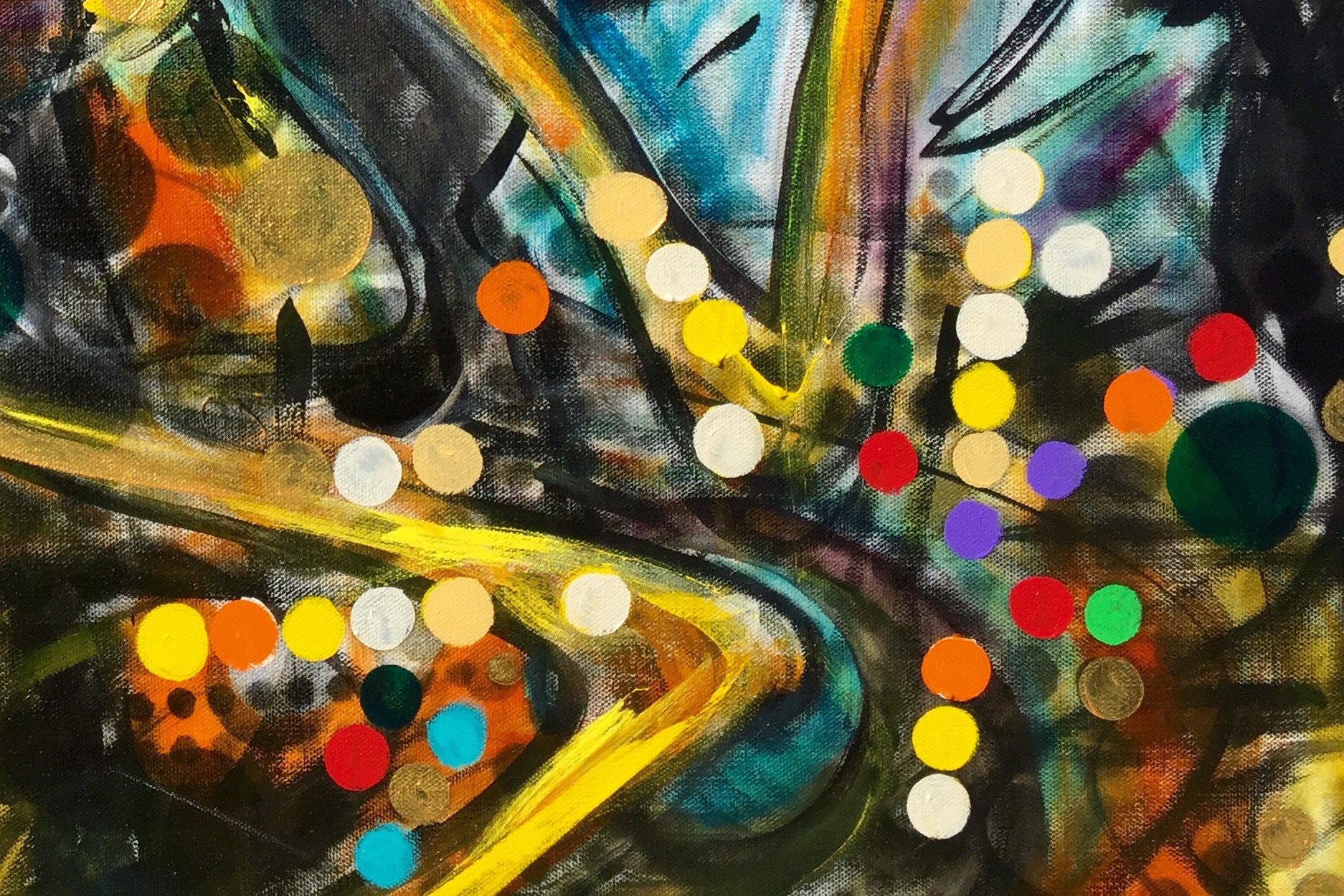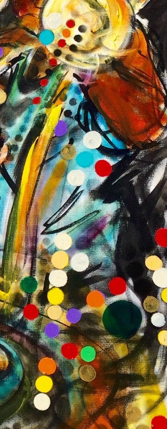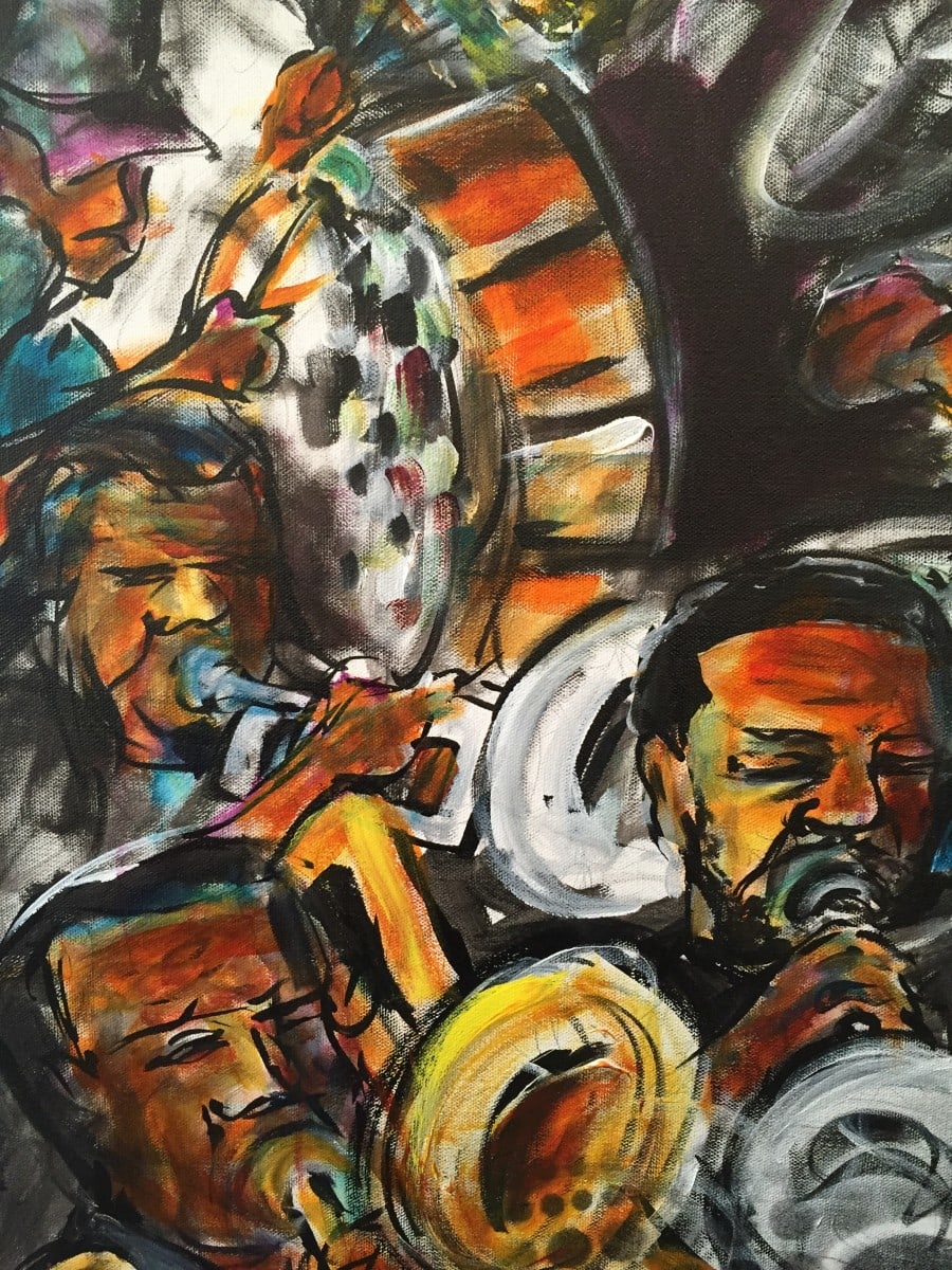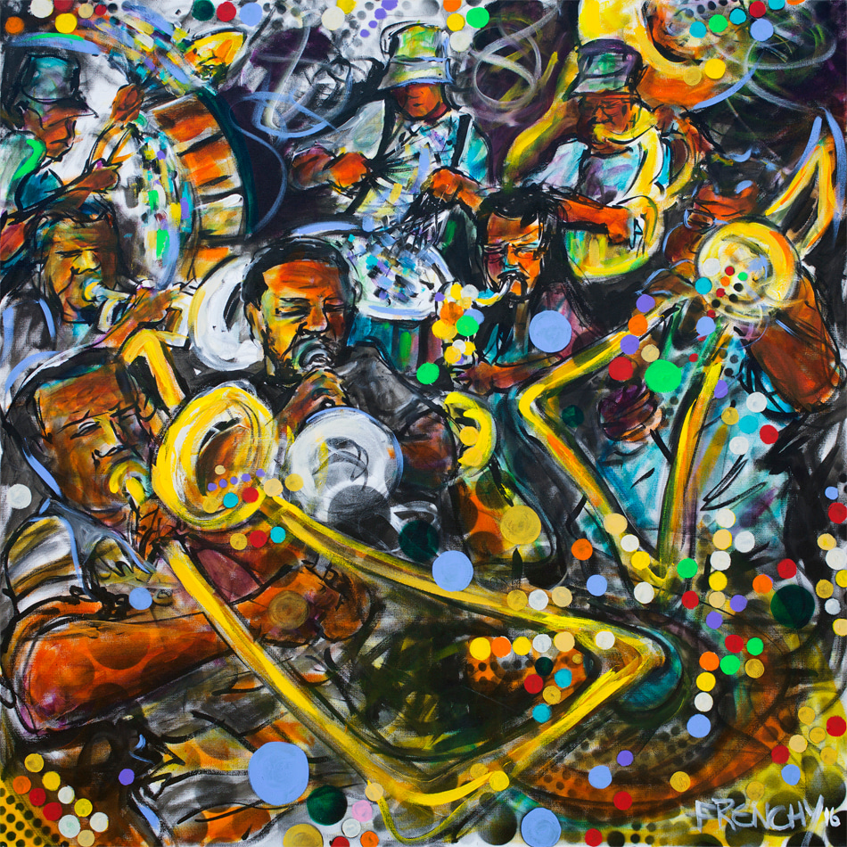 This painting of the Rebirth Brass Band was produced live on Tuesday June 7th @ the Maple Leaf Bar in New Orleans, This is my first attempt using my new Stencil & wash style for a live at the maple leaf "Rebirth" the use of solid color dots, allowing your eye to rest on top of the live action painting.