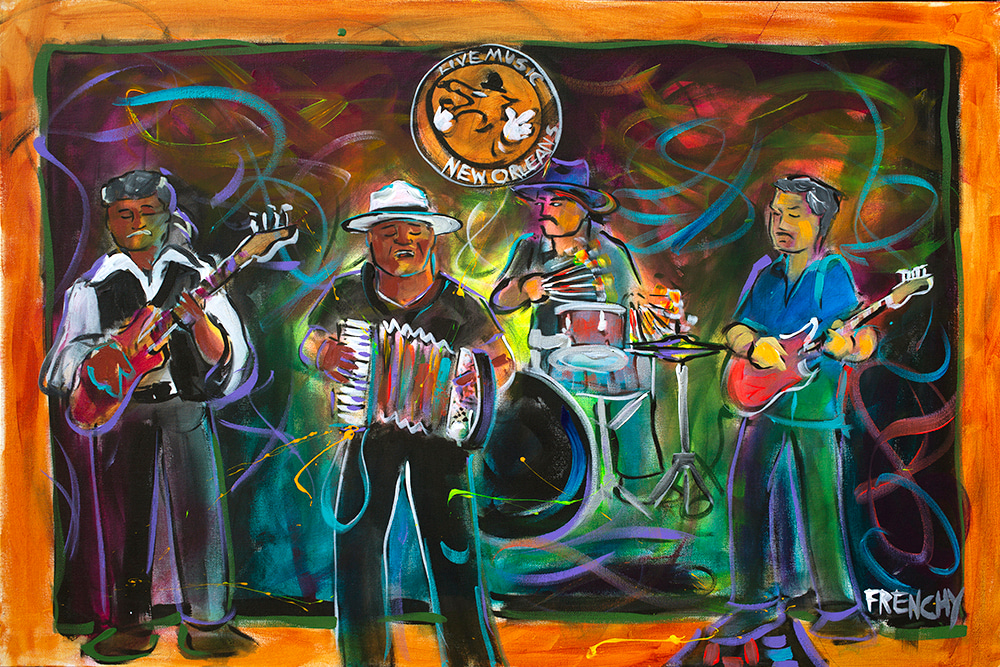 This painting of Sunpie Barnes & The Louisiana Sunspots was produced live at the Funky Uncle on December 29th, 2021.
