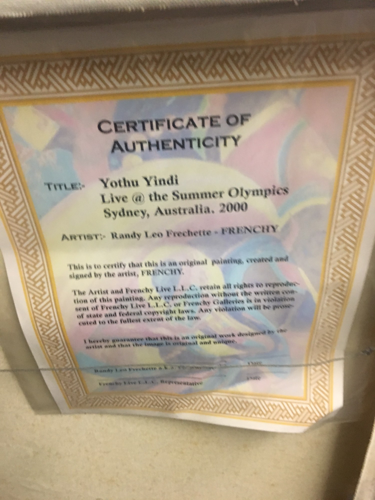 This painting of Yothu Yindi was produced live Sydney, Australia during the 2000 Summer Olympics