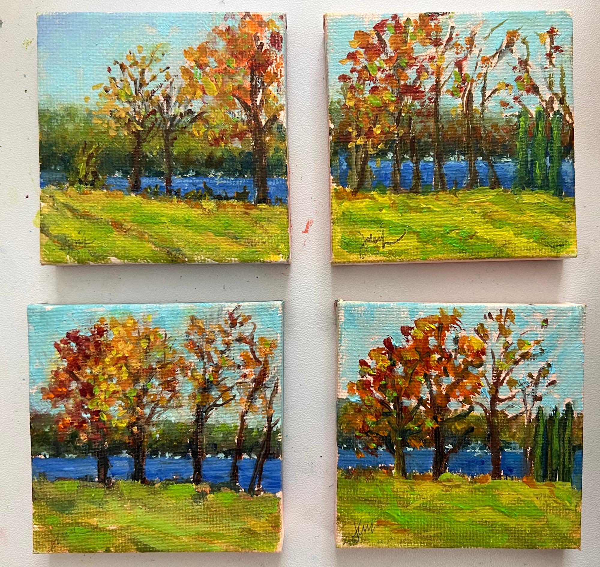 MessagePainted while sitting in the trunk of my car in the parking lot of Gypsy Bay in Cazenovia NY. Perfect fall day. Blue sky, red and orange leaves and deep blue lake.