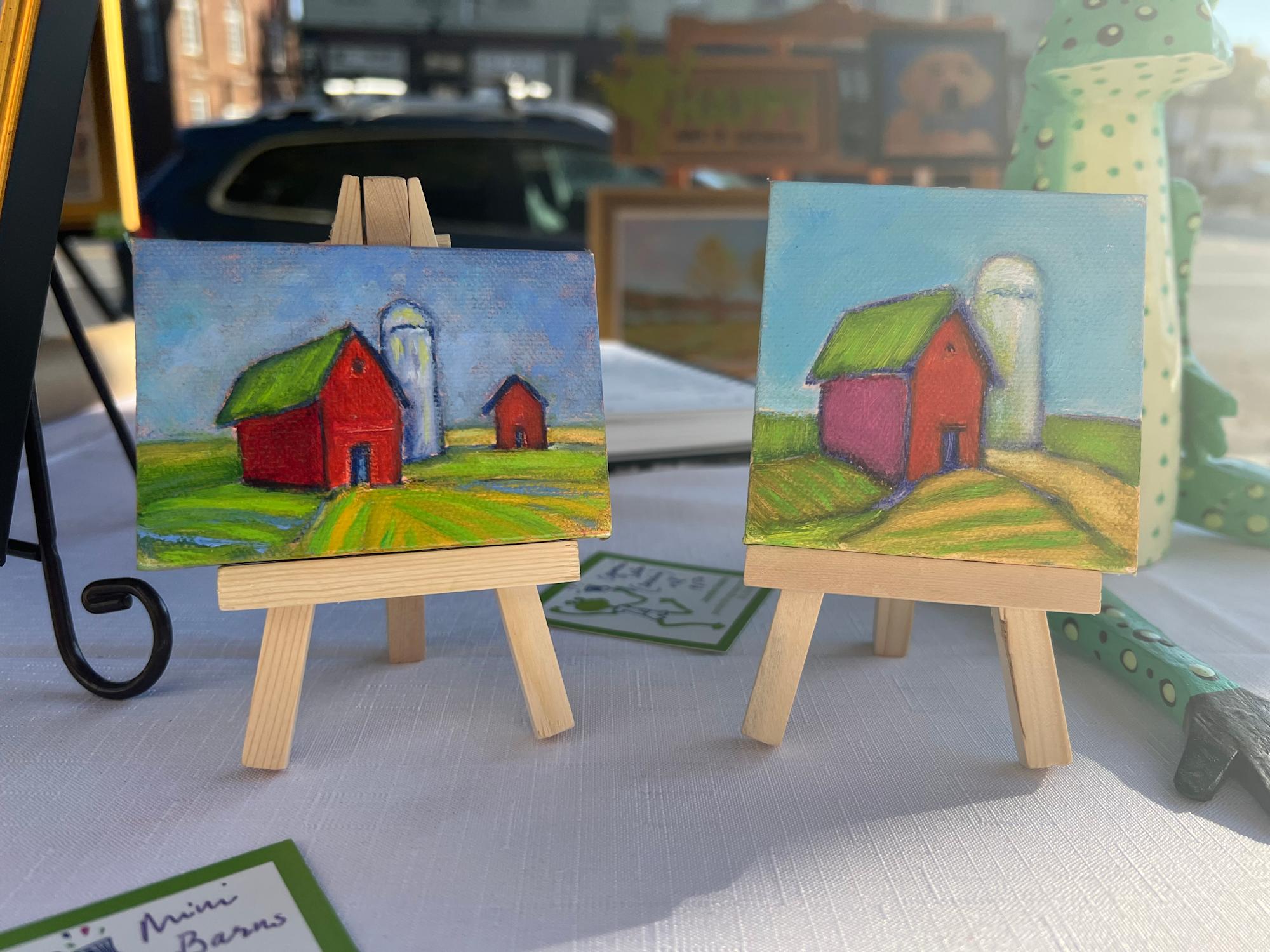 MessageThis little guy is an oil on canvas board, price includes small easel as well. Price is for one painting (in photo painting available is on the left). Celebrating barns through color and their interesting personalities always makes me happy.