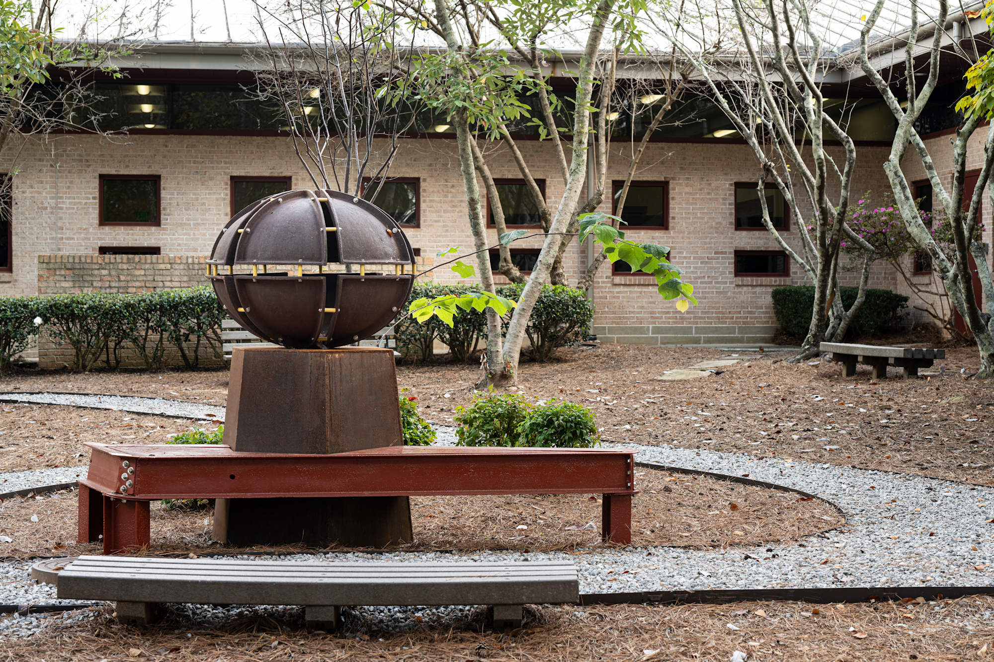 A bridge can be thought of as something that connects two separate things, especially when it overcomes a barrier of some sort that impedes that connection, like a river that makes it difficult to travel from one bank to the other. The cast iron ovum within this sculpture is made of several curved forms and the gaps between them, bridged by 36 stainless bolts as connectors. The bench is made from I-beams that were salvaged and recycled from the remains of the old Rogers Bridge. The corner of this triangular bench points directly northeast, but also directs you to the front doors of the North East Spruill Oaks Library. Please rest and enjoy the seating provided by this sculpture, perhaps while you read a book.
