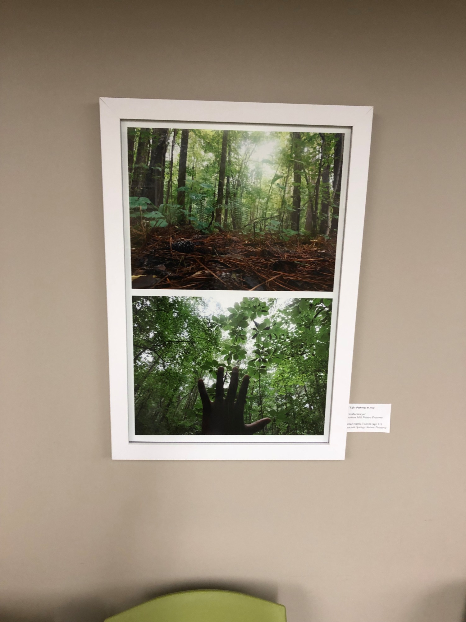 Witherspoon extended the project into the interior of the library by collaborating with photographer/naturalists Kathryn Kolb and Jessica Muhammad of EcoAddendum to create a community-based photography project exploring the natural landscape in South Fulton entitled Pathway to Awe. More than 50 community members of all ages and backgrounds participated in nature hikes/photography workshops that traversed Herbert Greene Nature Preserve & Utoy Creek, Cascade Springs Nature Preserve, and Cochran Mill Nature Preserve during the summer of 2016. These participants produced over 1,000 digital photographs of trees, plants, wildlife, and landscapes. From these, the artists carefully chose twenty-four images by fourteen participants – their final selections based on artistic merit and a desire to include a variety of perspectives on south Fulton County’s beautiful natural features.