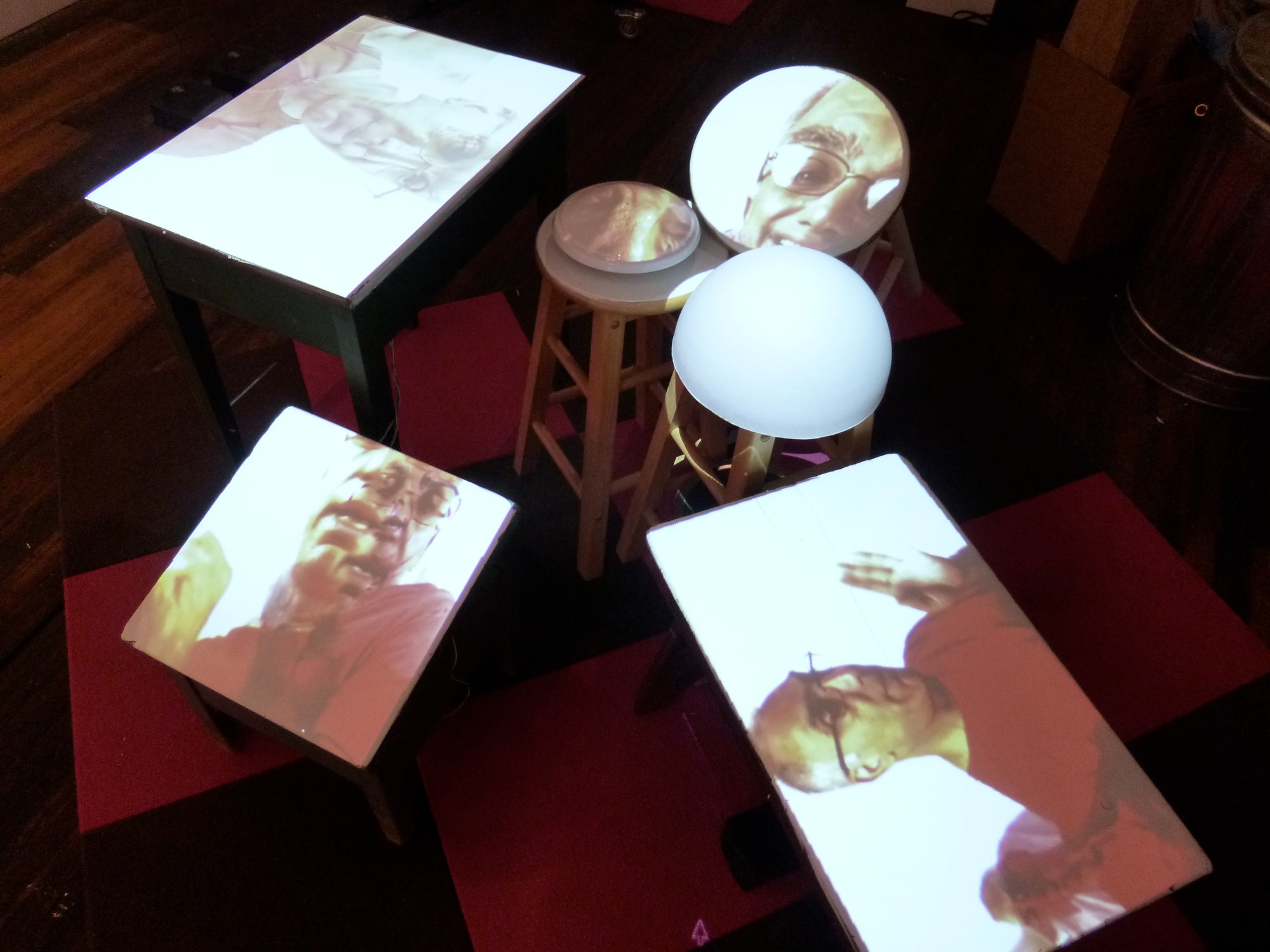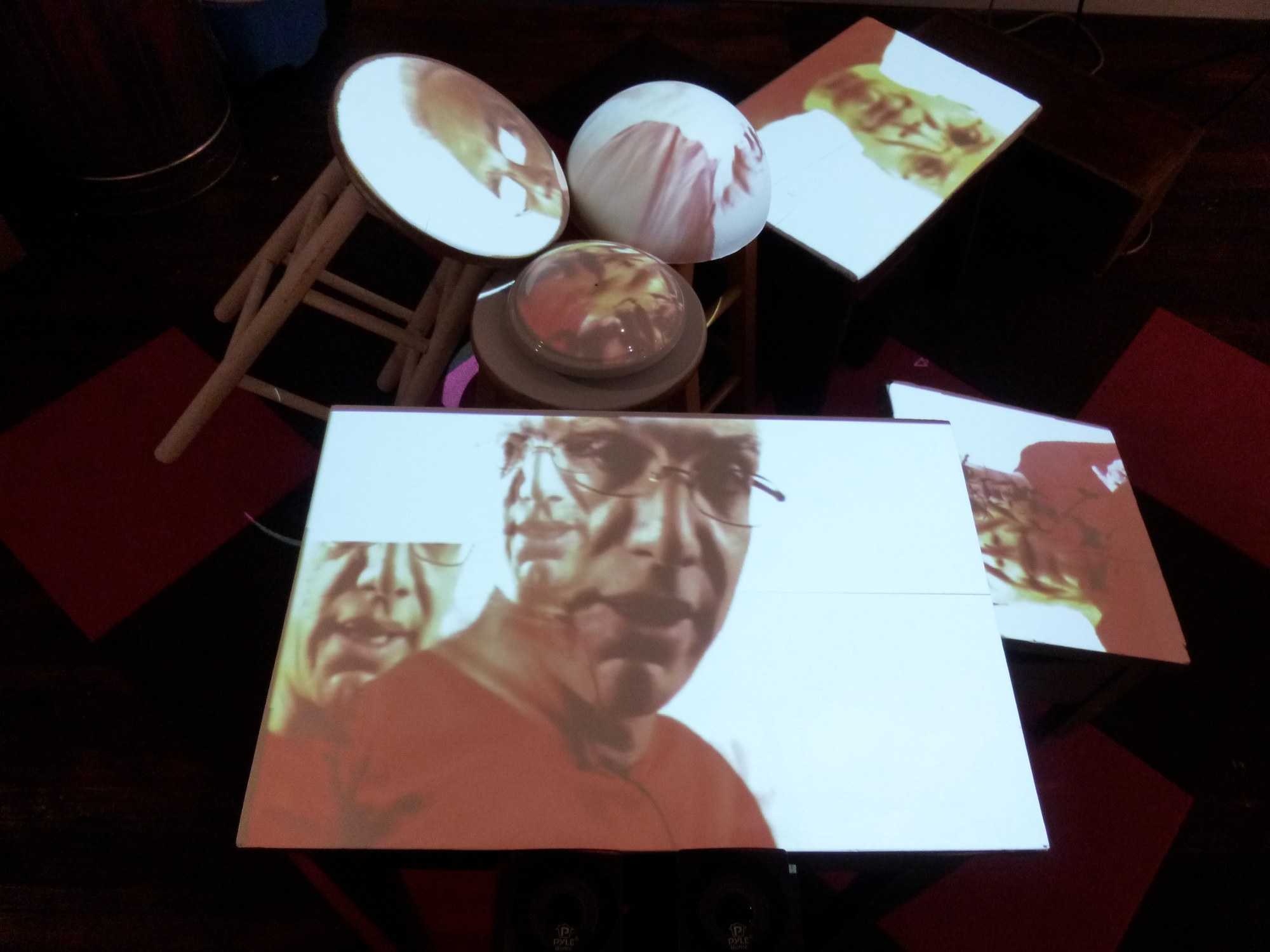 This work uses projection mapping and four channel sound. Speakers are used to place sound in the sculpture, tying the sound to a location. One must walk around the sculpture and lean into it to hear separate sound tracks. The checkerboard carpet tiles and painted country furniture physically root the piece in real space. The video projection and sound are married to the furniture. The videos projected are rant performances I did in 2006. I enlisted Brian Caiazza to shoot the video and do the post production. This is also a collaboration with Brian. My video performance goes back to the 1970’s when I was one of the first performance artists to work in the form. I havemade performance rants for many years altering the formats to keep the form fresh for myself. This latest presentation breaks the linear theatre like presentation format by presenting the videos all at once. The viewer is not seated but must walk around the installation to percieve it. The videos and sound are used as textures rather than discreet presentations. What happens is that the emotion and the feel of the the works comes through while the story-line is de-accentuated. The historical references are to Rauschenberg’s Combines (with the furniture), Neo-Geo (with the carpet tiles) and Video-Performance Art. It also uses a computer and custom software to root the work in the current discourse.