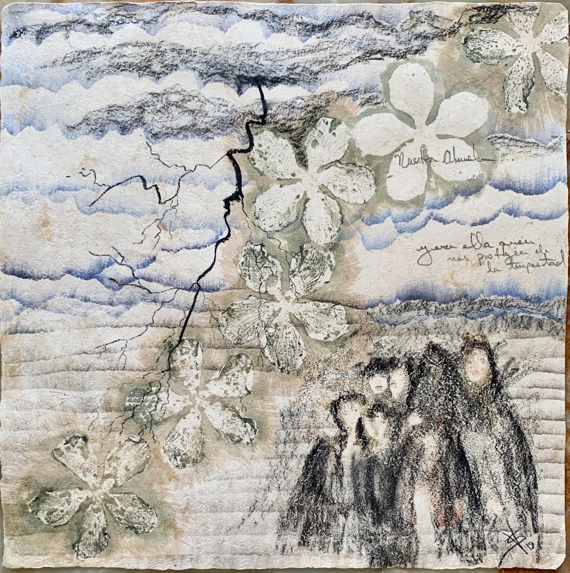 Charcoal, pigments, graphite and floral pigment print on handmade amate paper