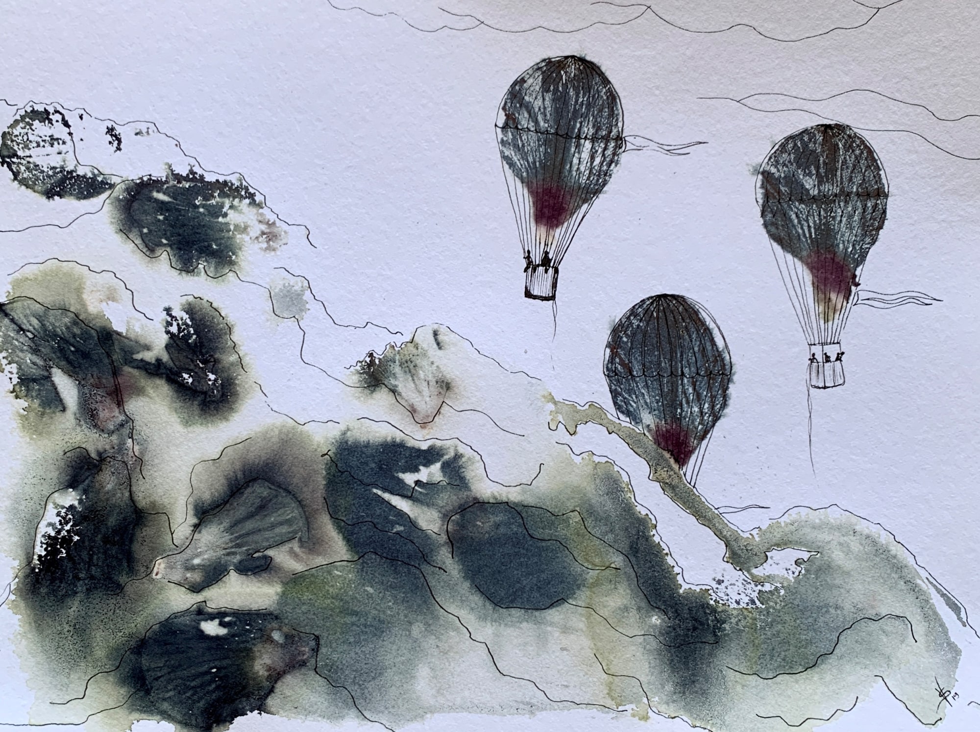 Chinese ink and floral prints on watercolor Hahnemühle paper