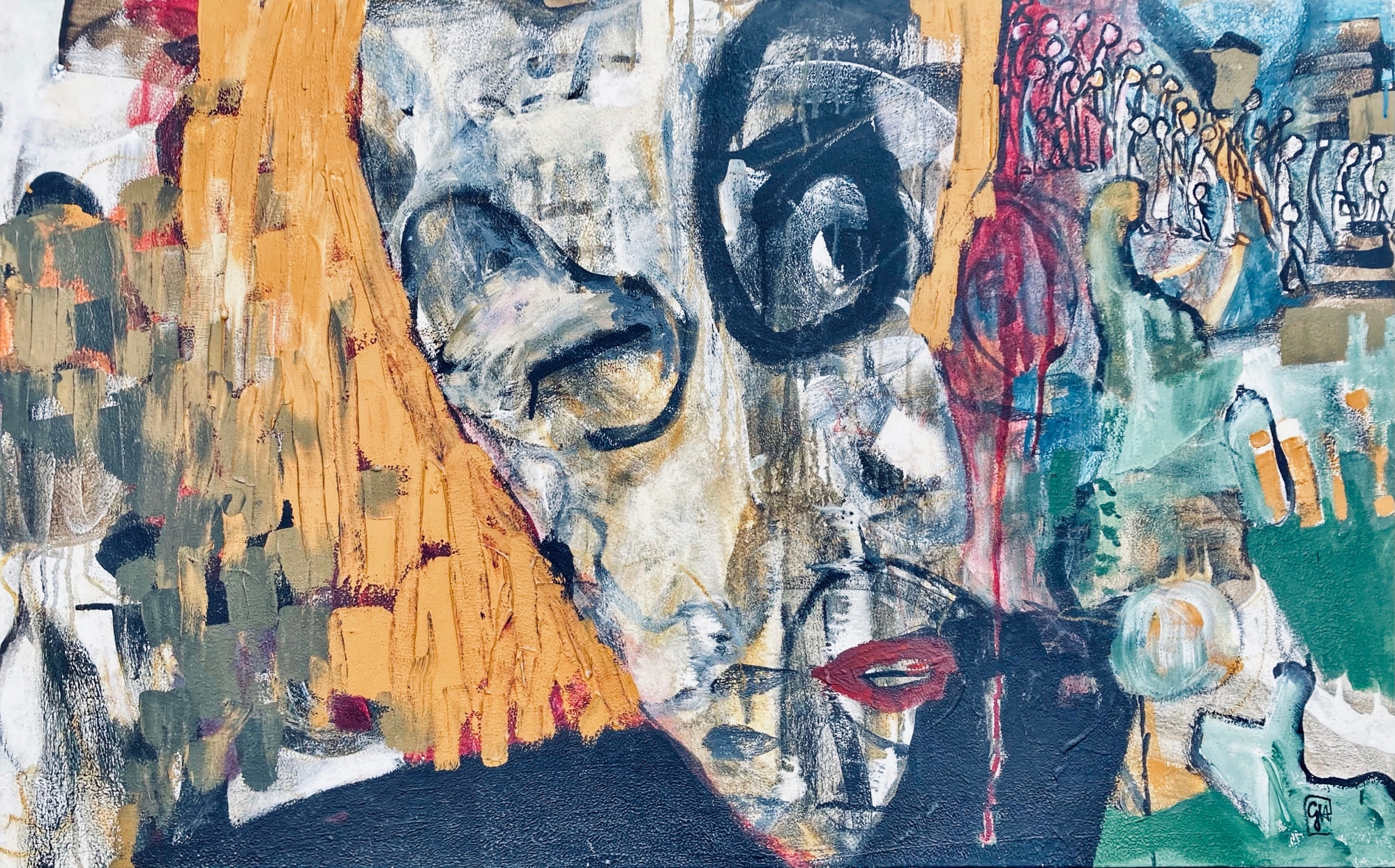 This piece, painted after finding out that a family member was an agent in the Nazi regime, sparked her “The Indelible Mark” collection in which the German-Canadian artist investigates the legacy she inherited growing up in the wake of the Holocaust, as well as belonging and exclusion and the relationship between German guilt and de-colonial healing in her adopted home in Canada.