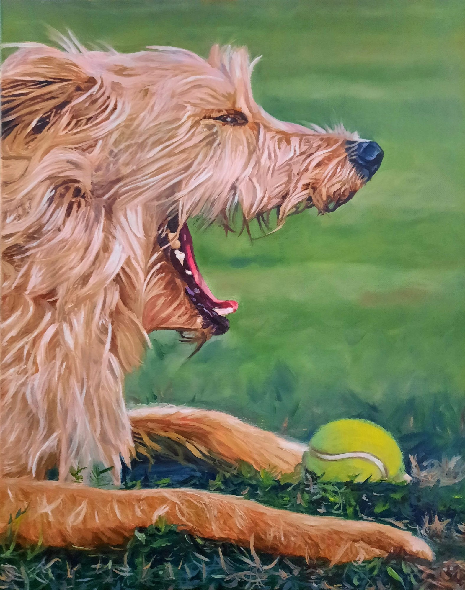 In this delightful painting, a scene of pure canine joy unfolds under the bright, sunlit sky. The setting is a lush, grassy meadow with the vivid greenery stretching as far as the eye can see. The happy dog, named Lucky, is panting lightly, as he sits on the grassy ground, tongue lolling out and eyes bright with excitement and contentment. The dog's fur is tousled and slightly damp, suggesting the fervor with which it had been chasing after the tennis ball moments before.