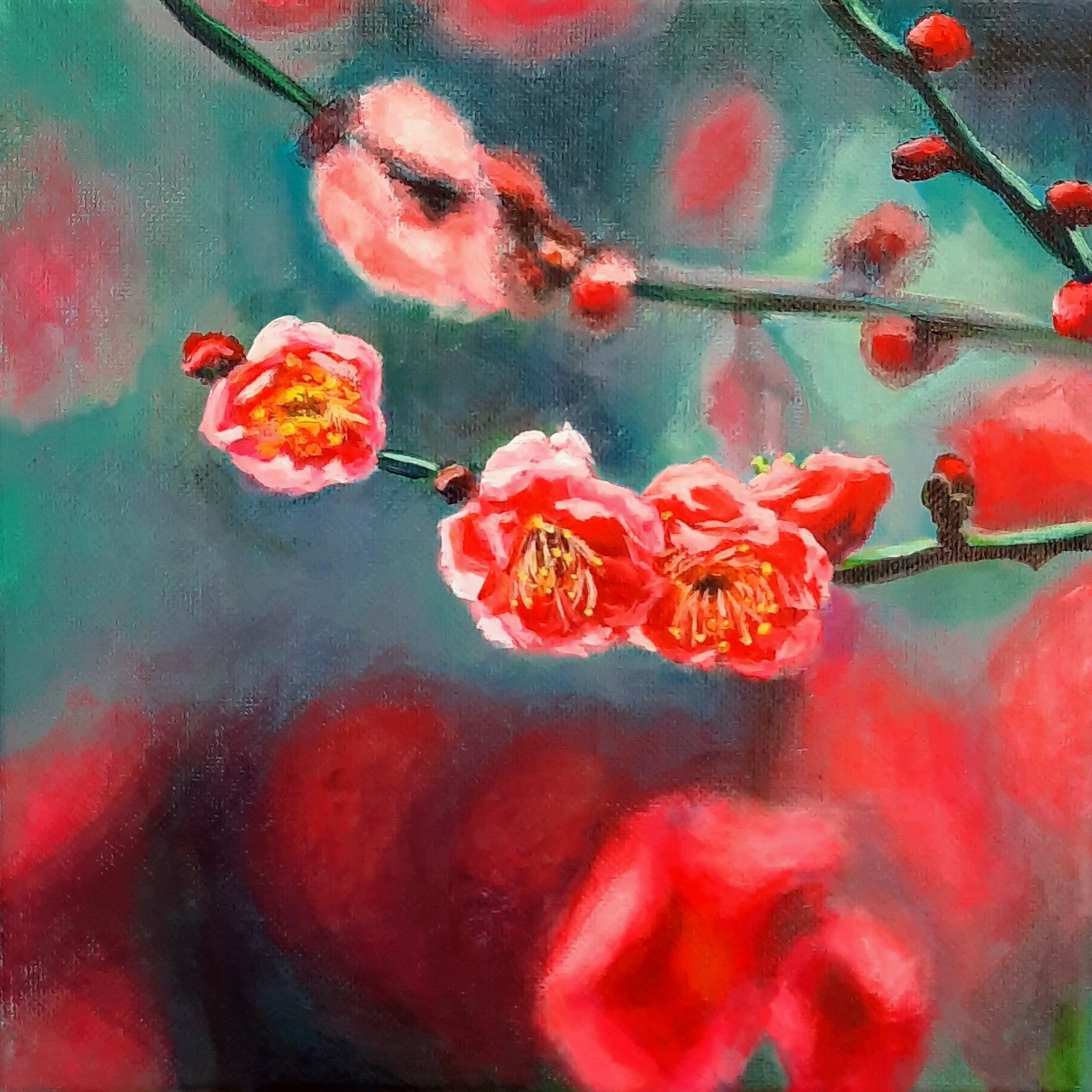 This color palette suggests the interplay between warmth and coolness, echoing themes of life, renewal, and perhaps a call for attention to the beauty of nature's fleeting moments. The title, which translates to "Look at me, I'm here," reinforces the sense that these blossoms are calling out to be seen and appreciated, capturing a moment of vibrant existence in a serene world.