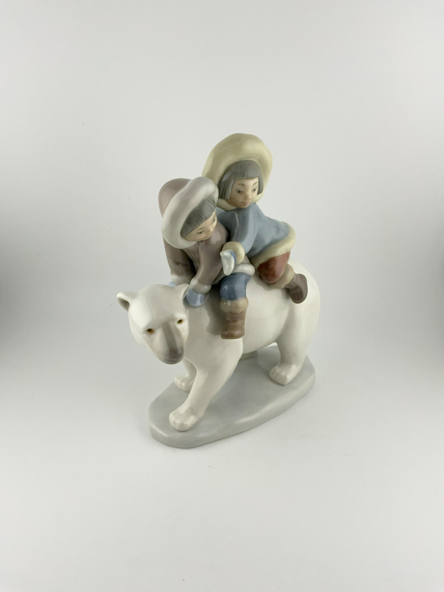 This beautiful Lladró porcelain figurine by the Spanish sculptor, José Puche features a stunning scene of two small Eskimo children riding on a Polar bear. Handmade in Spain this figurine is a true masterpiece. Measuring 5.5 inches in length, 7 inches in height, and 3 inches in width, this medium-sized figurine is perfect for any room and any occasion. The glossy finish and multicolor design make this figurine a true gem in any collection. It comes unboxed and is an original piece, not a reproduction. This retired figurine from the "Eskimo Riders" collection is a must-have for any collector of animal-themed decorative collectibles..