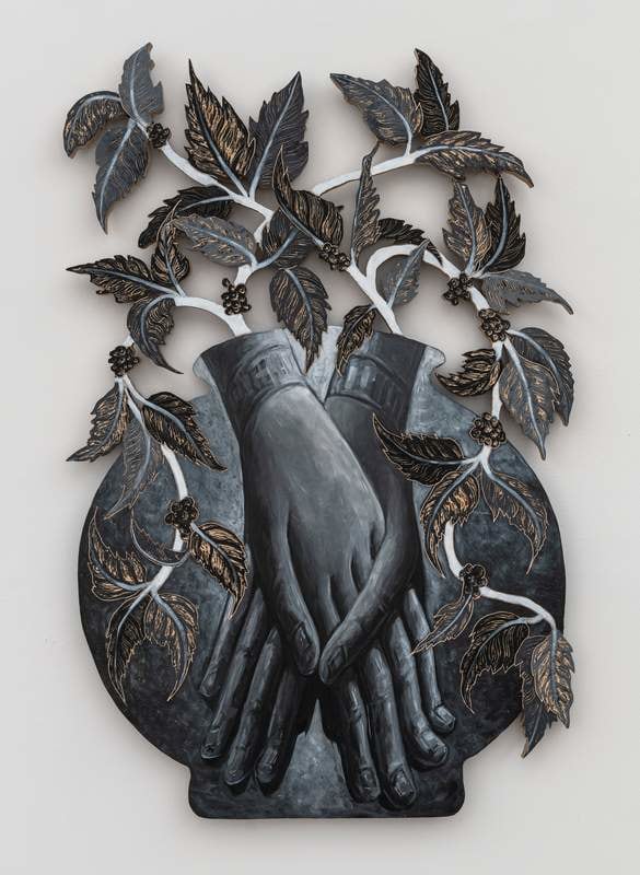 Poison ivy engulfs the embrace. During the time Lujan was creating this piece, the studio and house where she lives in the US were starting to become surrounded by the fast growing ivy, which has only (unfortunately) thrived this summer. Ivy is an incredibly resilient plant, it can still cause poisoning even if the plant is dead (for up to five years), the conditions it needs to grow are extremely adaptable and they grow in many different forms (bush, vine, climbing vine, etc). 85% of people are allergic to it and the rash is very painful. Lujan chose this plant for this piece because its danger upon the general population reflects the political climate the majority of the world’s views and regulations (especially what she has witnessed in the US for the past 7 years) on one’s choice for who to love. Hand in hand, despite what its dangers can imply.
