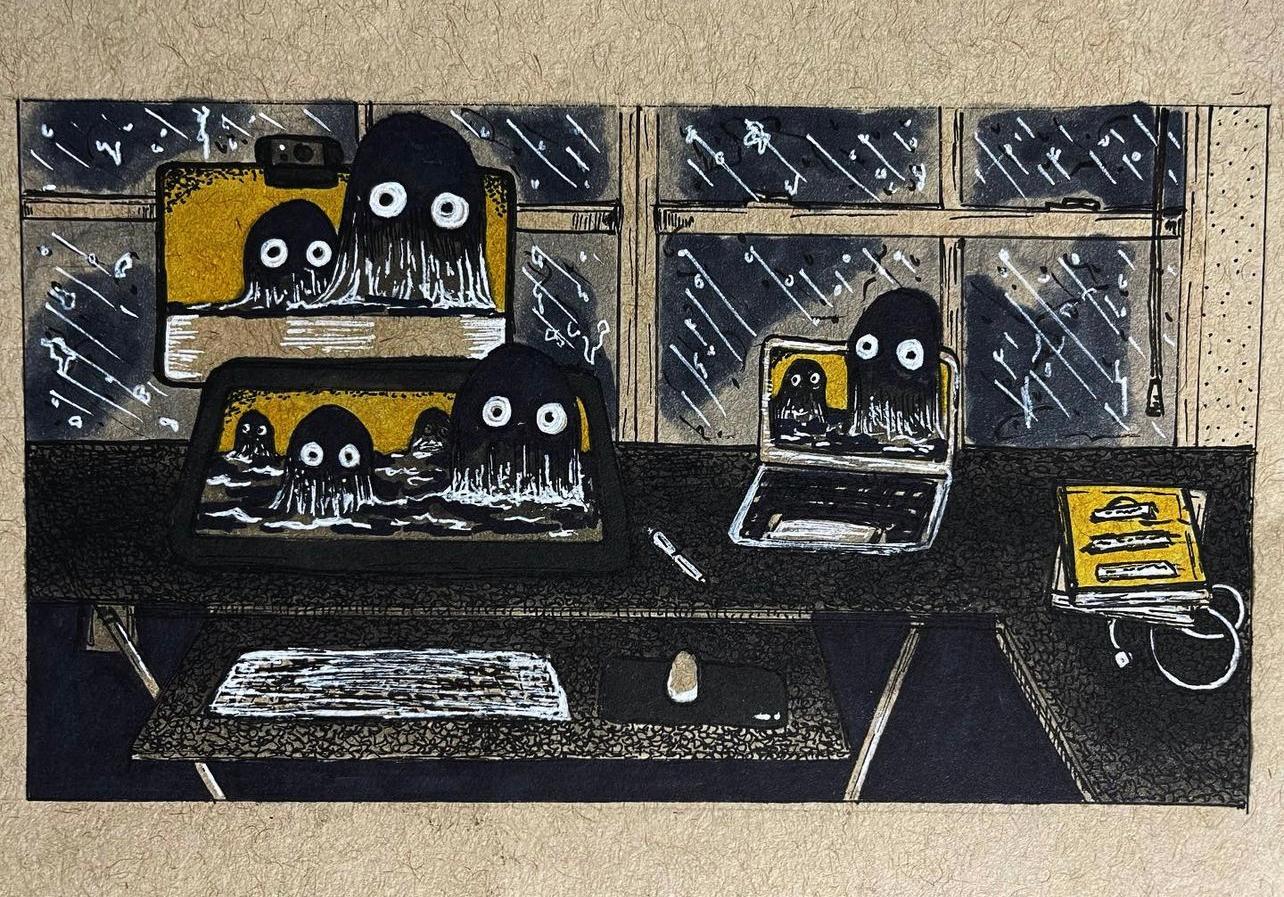 Umi-bozu, ghosts of ocean storms and tsunami surf the web to watch over work from home productivity.