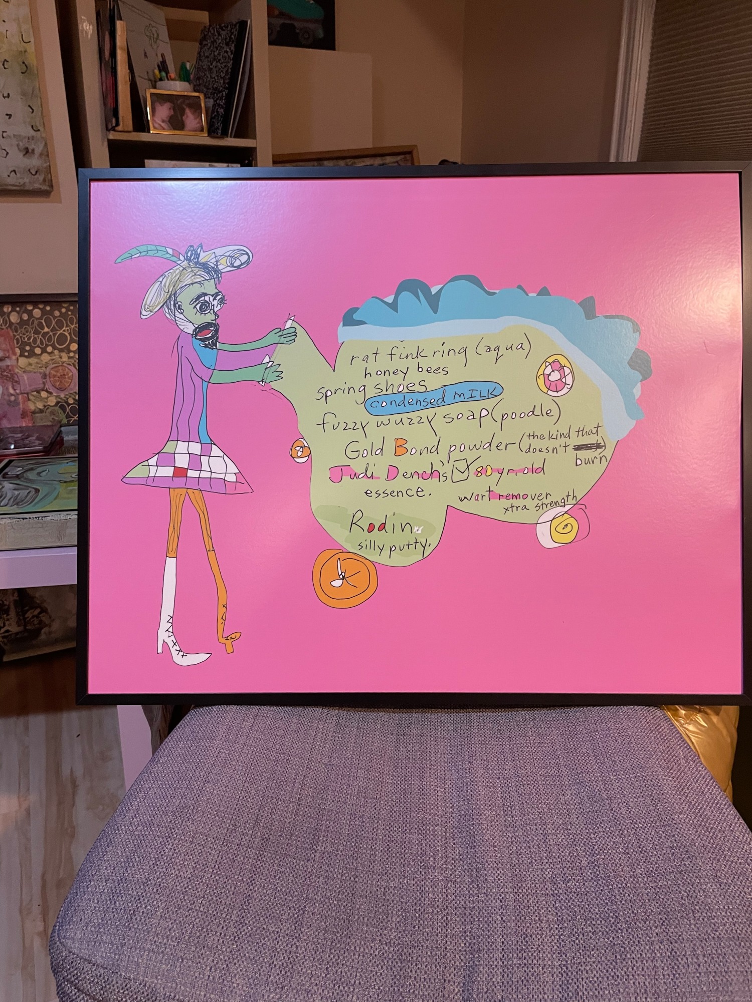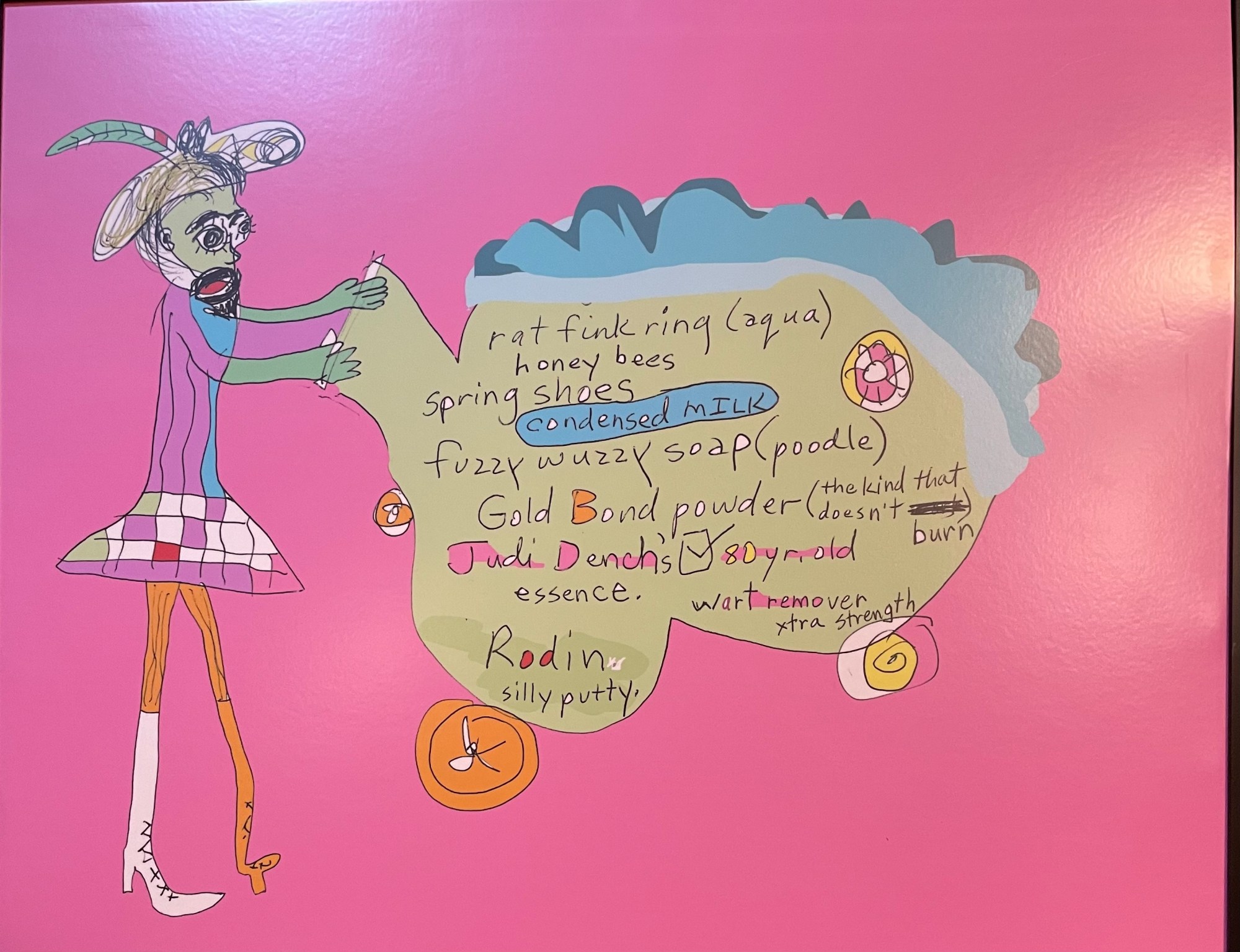 Mom pushes a grocery cart with a stream of consciousness grocery list inside