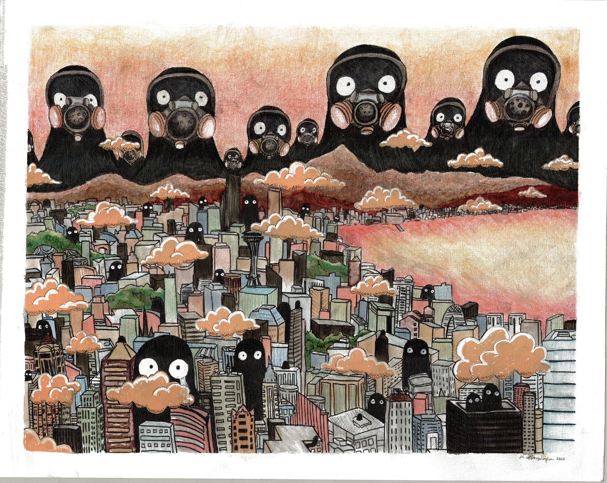MessageUmi-bozu, the gods of tidal waves and ocean storms, struggle to breathe within a smokey and overpopulated Seattle. This piece takes the perspective of how Seattle may be described hundreds of years in the future.