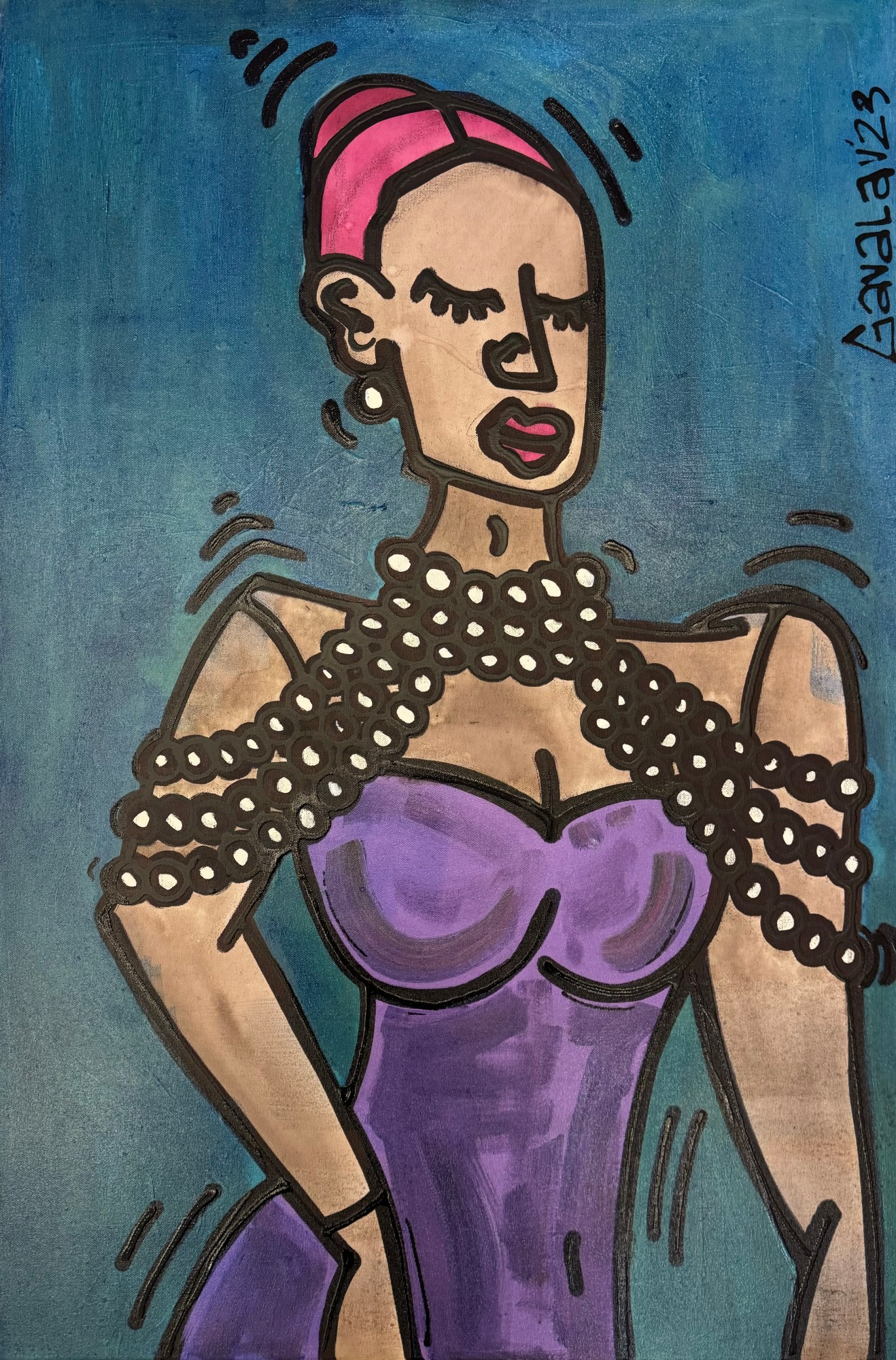 "Pearls of Grace," features a striking figure adorned in a purple gown and an abundance of pearls. The subject's poised and elegant posture is juxtoposed by the rhythmic motion lines surrounding her, suggesting movement and vivacity. Her pink hair and bold red lips add a touch of modernity and flair, while the rich blue background enhances the overall composition, highlighting the timeless beauty and sophistication that pearls symbolise.