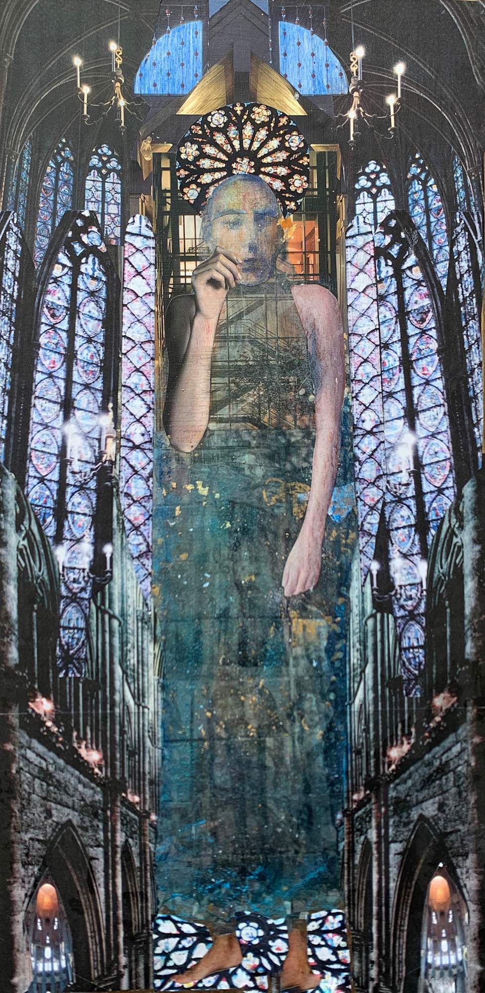This is part of a series of women with bisexual faces. This series has morphed into a "Broke Baroque Ladies" series. It is done on a cradled board and finished with resin. It features photos of St. Chappelle in Paris.