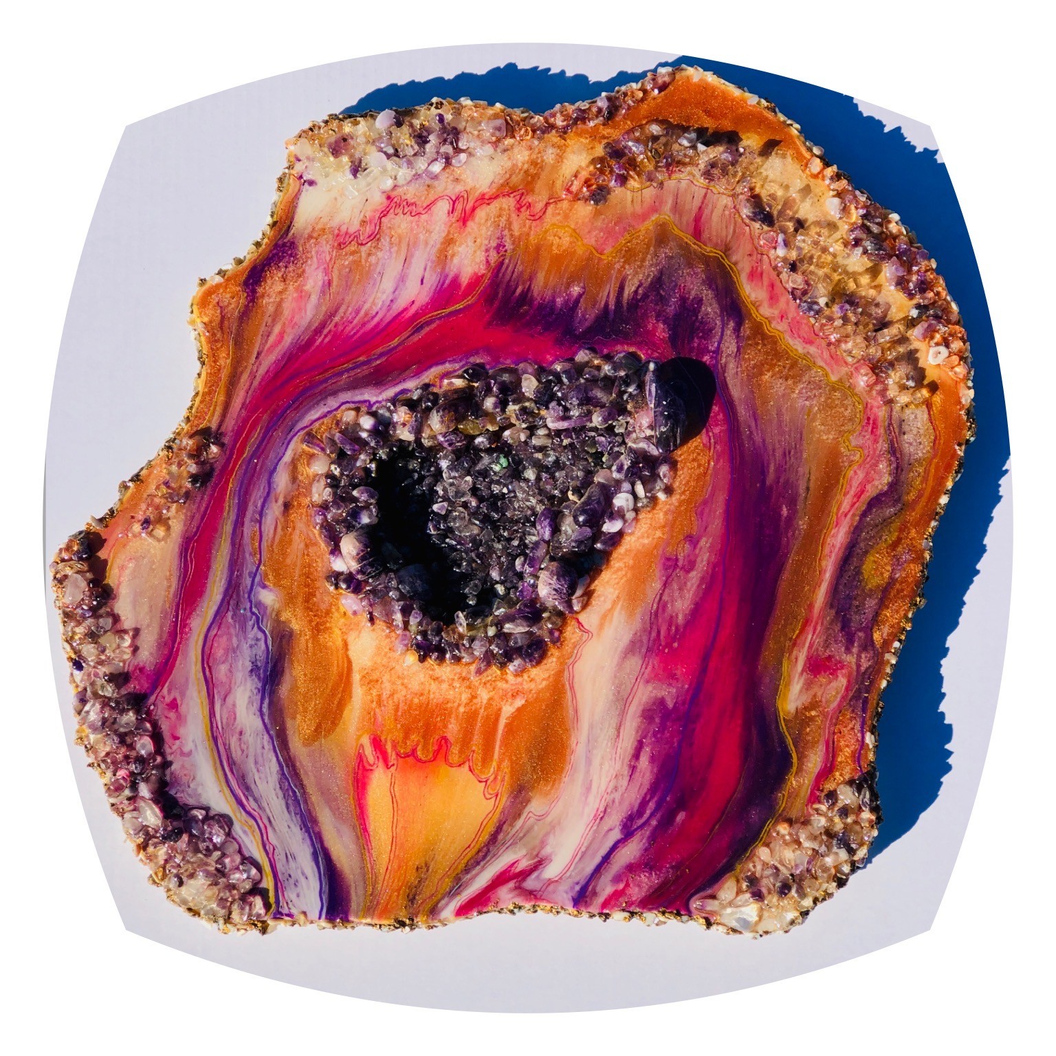 This stunning Geode inspired Resin artwork has real Amethysts in the middle, Fire Glass and Amethyst Chips along the edges, and crushed shell around the outside edges.