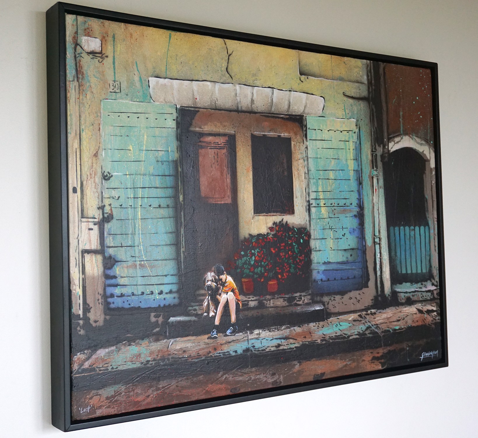 This painting is based on a photo I took of a typical doorway, in a small village when holidaying in Provence in 2018. I have added the boy and dog in to create a narrative. This is the third iteration of this stencil painting.