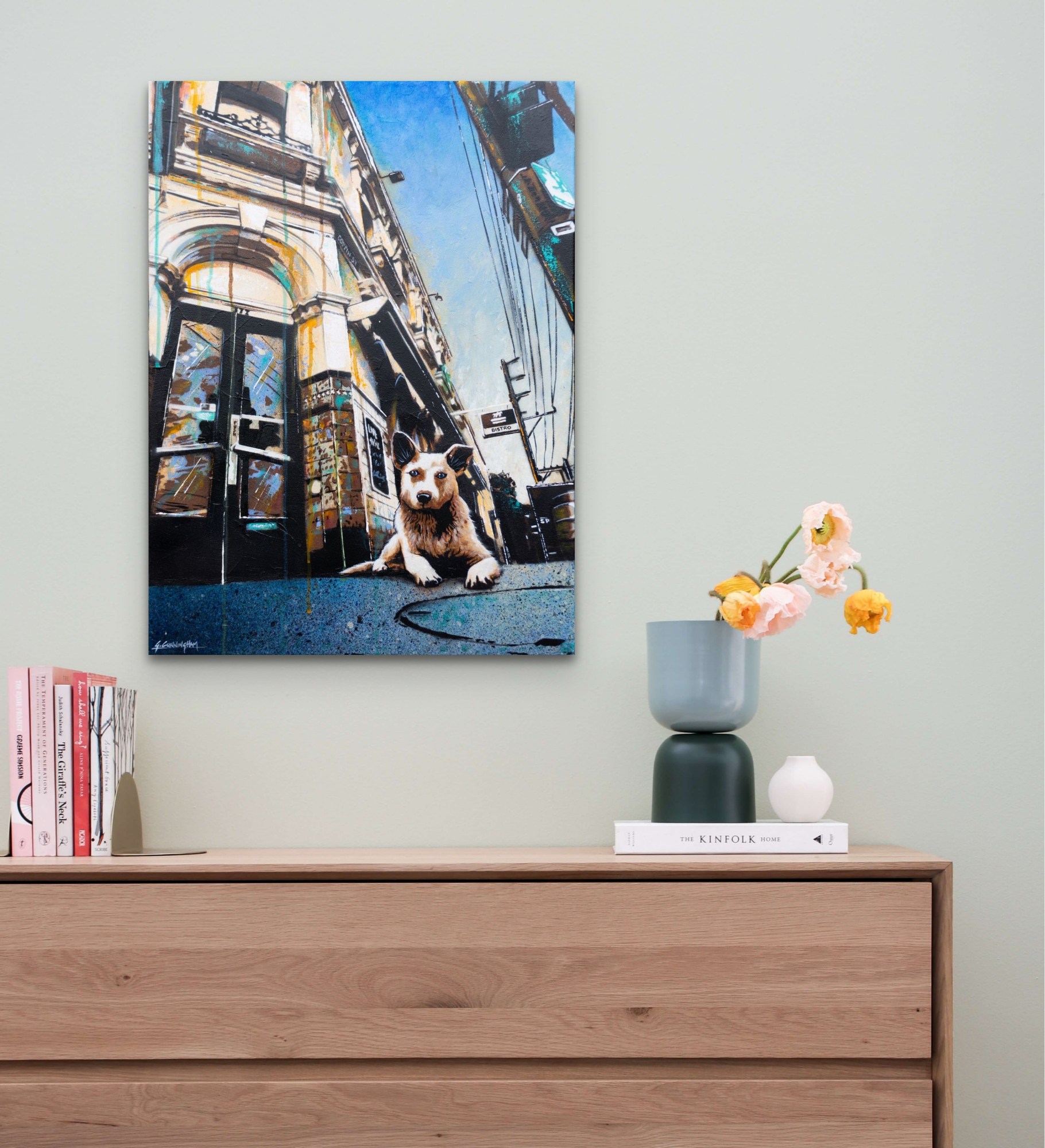 This painting is based on a photo I took of the Spread Eagle pub in Richmond, but it could easily be anywhere in Australia as the classic Aussie pub is easily recognised by the exterior feature tiles, awnings, and the occasional dog waiting outside whilst its’ master has a quick drink on their evening “walk”!