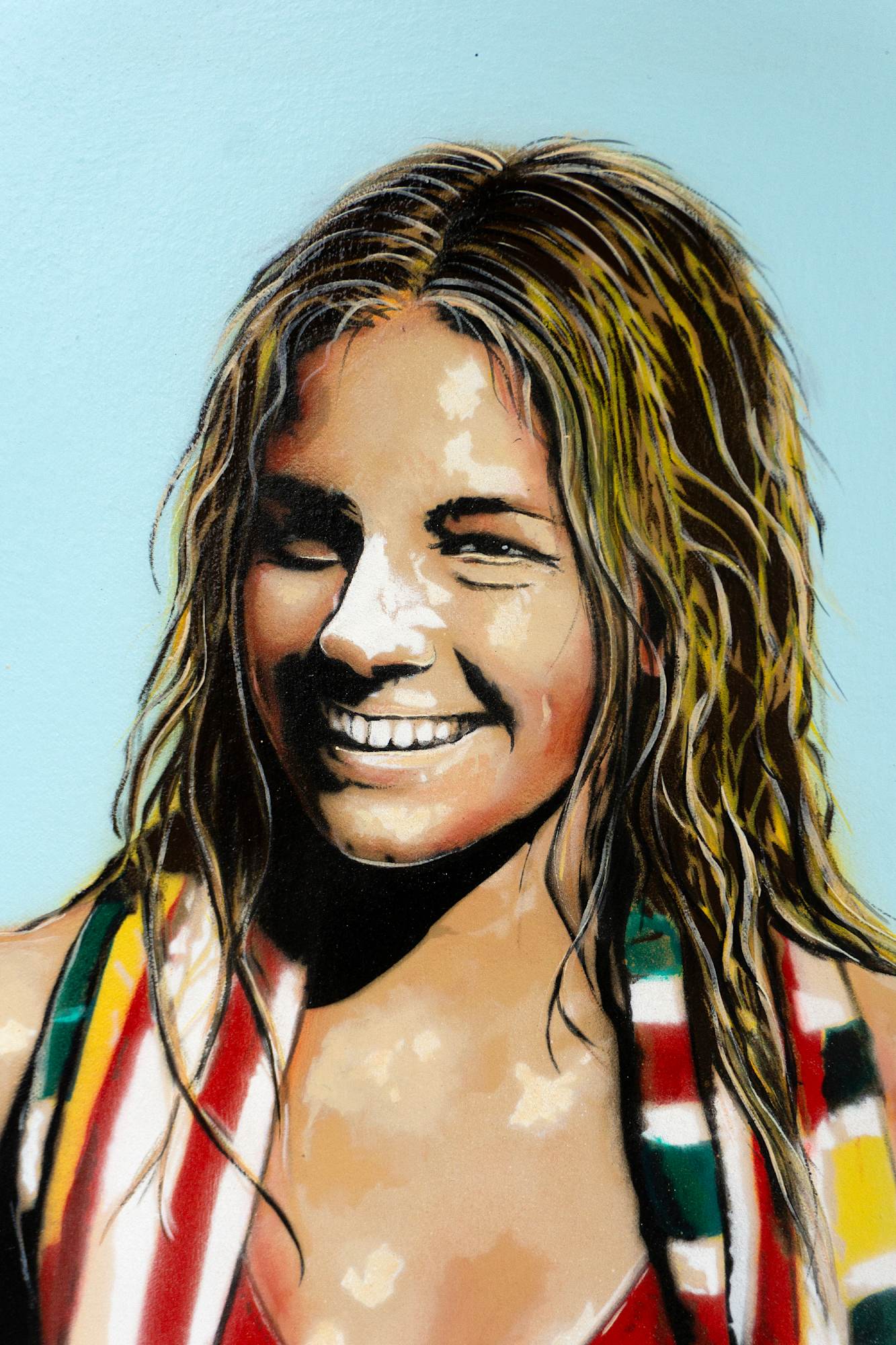'Sunshine State' captures the essence of an Australian summer — golden light, salty skin, and that carefree grin that only comes after a great surf. Wrapped in stripes and confidence, she’s the spirit of those endless beach days: bold, natural, and utterly alive.
