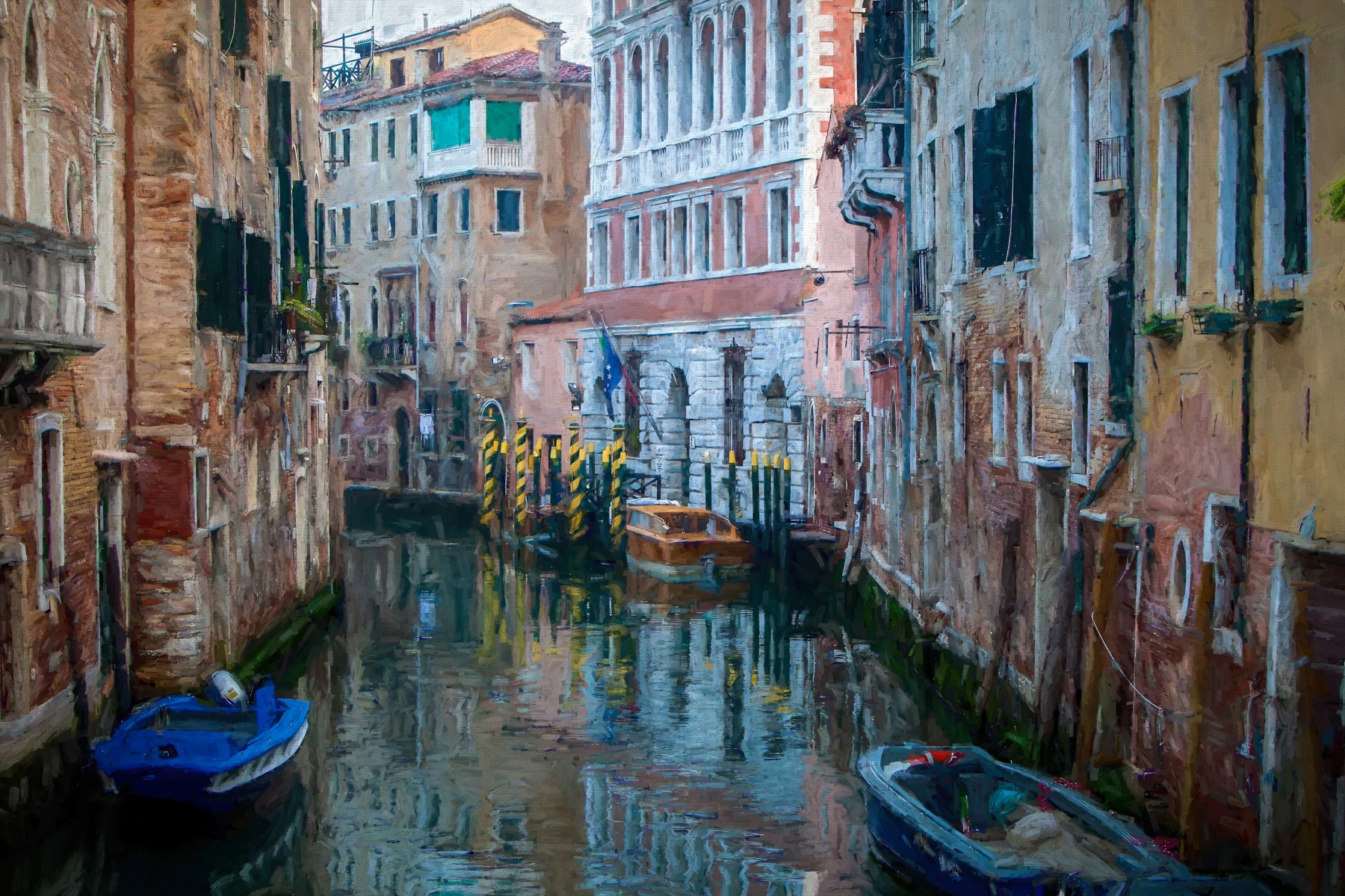 Canal view, Venice Italy. Photograph digitally manipulated by the artist to achieve appearance of a hand painted canvas.