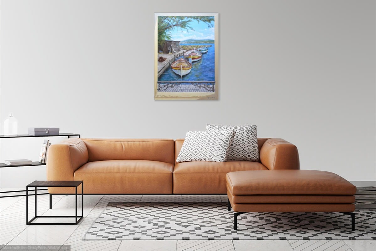 "After Fishing" is a waterfront painting in "Trompe L'oeil" style, featuring a view from a window in front of a stone promenade. Three colourful boats are moored along an old wooden jetty, and a fisherman's cabin is visible in the background. The calming blue water and distant mountains create a picturesque moment. The painting evokes a feeling of rest at the end of a day's fishing.