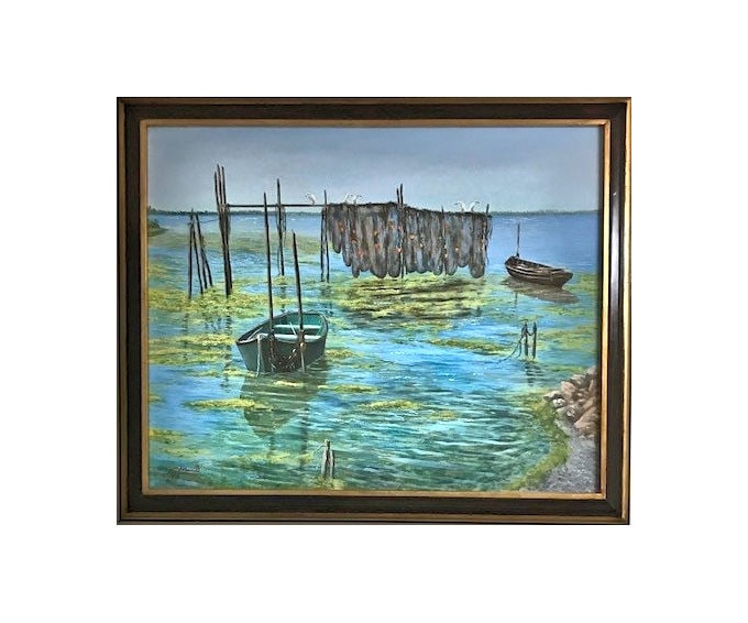 " Until the Next Catch" is a tranquil maritime scene with a focus on traditional fishing practices. A large net, adorned with bright orange floats, is drying in readiness for the next bountiful catch. Seabirds perch nearby, patiently waiting to scavenge, adding a touch of curiosity to the scene. Two rowboats gently float on the clear blue water, surrounded by aquatic vegetation. The minimalistic horizon emphasises the vastness of the calm waters, harmoniously meeting the sky. Bathed in a clear blue hue, the sky suggests favourable weather for fishing, adding an optimistic touch to the scene.