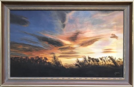 "Whispers of Morning" captures the beauty and drama of a sunrise sky. The light golden colour of the early morning sun can be seen through dark vegetation, while the dark sky is gradually giving way to sunlight. The dynamic brush strokes and warm tones create a sense of movement and emerging light. Truly a piece that will bring a sense of calm and wonder to any space.