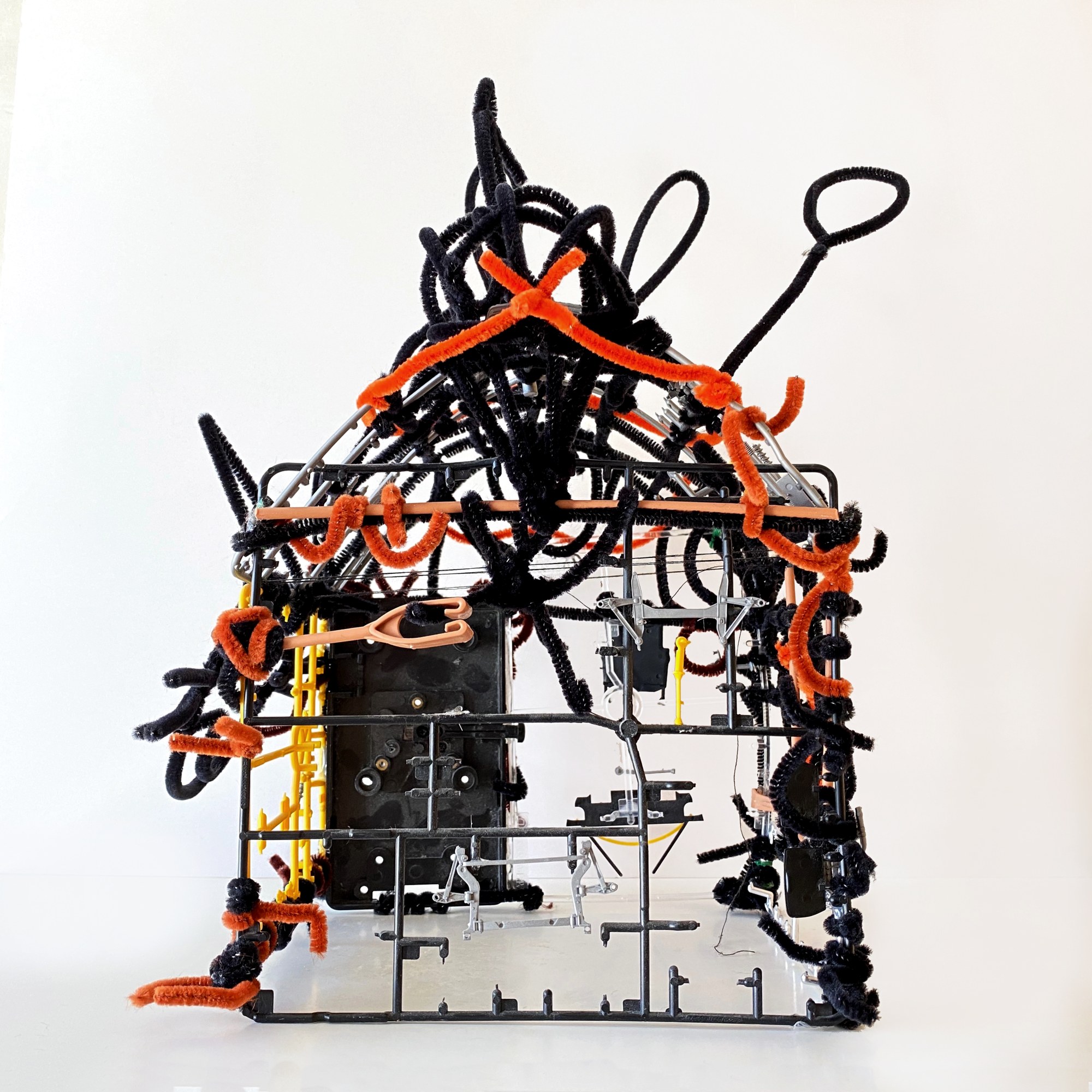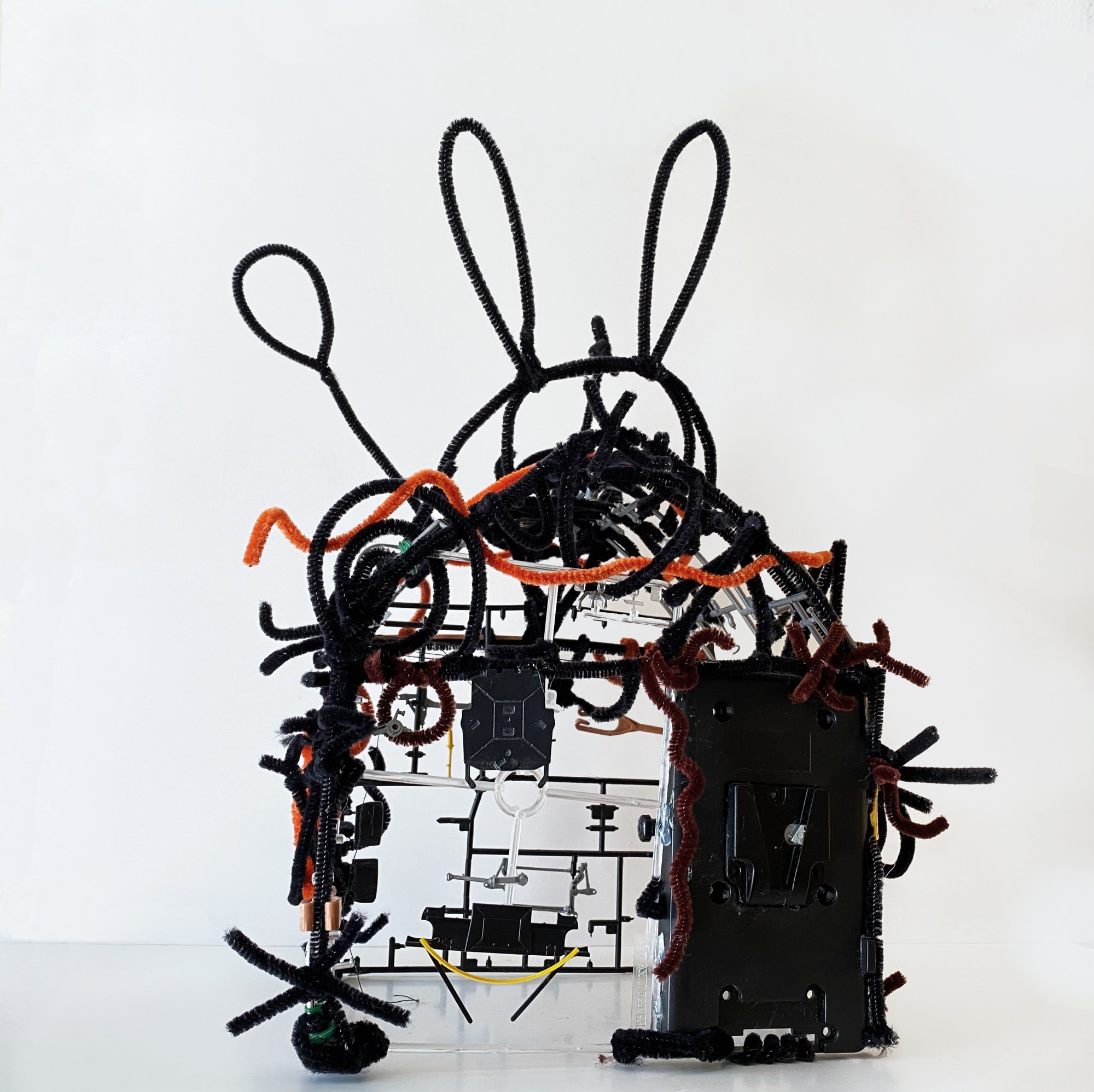 A miniature Porsche model was assembled from individual parts. The remaining leftovers are usually thrown away, which were in this case kept, assembled again in a new artistic order and together with wires transformed into a new sculptural space. ...and all of it, just because of the Porsche!