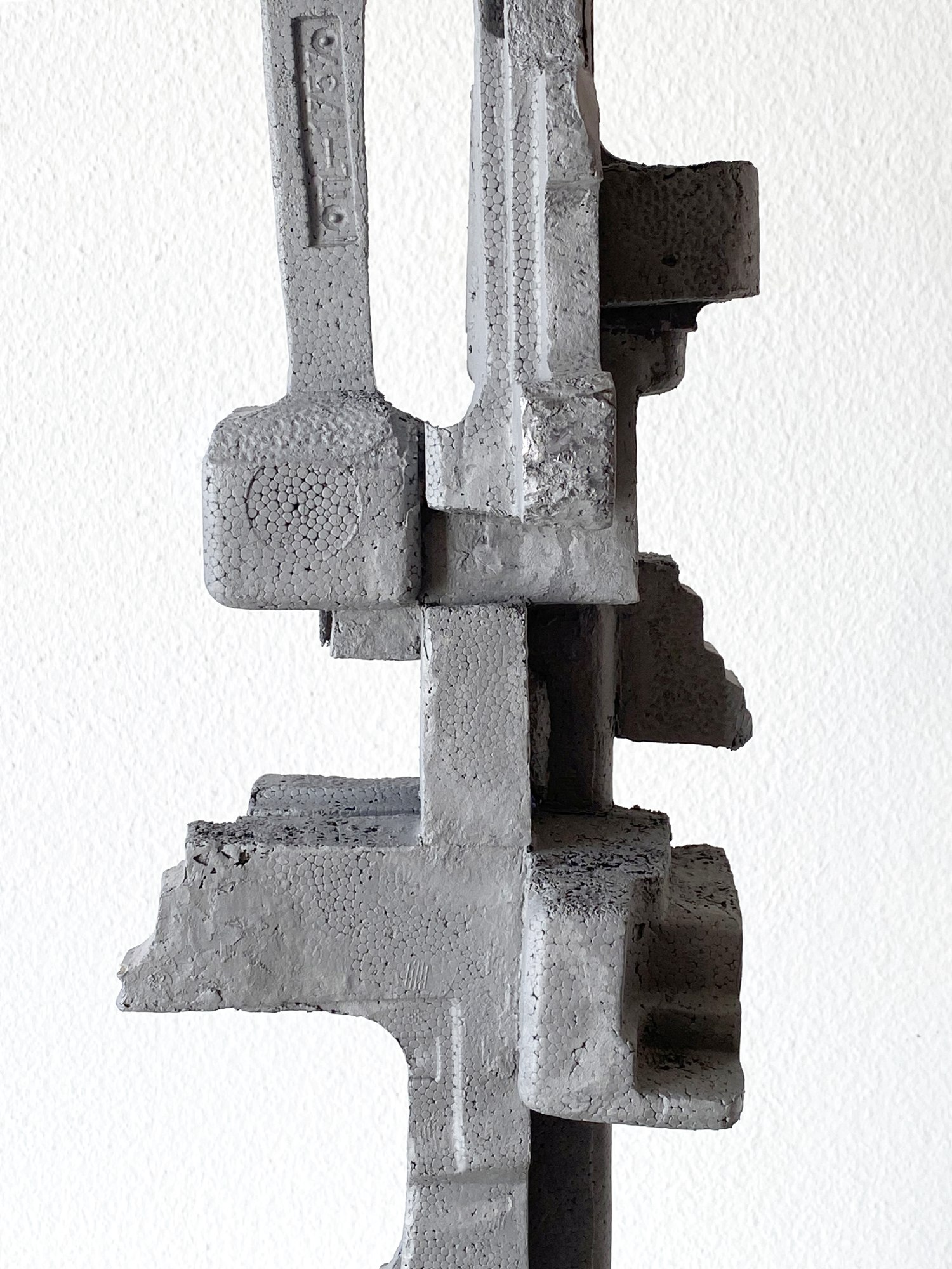 An abstract cubism styled sculpture right out of the Industrial period, where metal was the main focus and media to use. The sculpture looks like a piece of concrete and a leftover either a fragment from a dream or an eroded piece of a building. There are many corners which connect you to corridors, there are stairs leading to to nowhere and the surface of some parts look eroded as we know them from rotten houses standig lost in the landscape. This sculpture will also provide for sure your own personal journey of your own experiences, dreams and what you will experience while looking at ít.