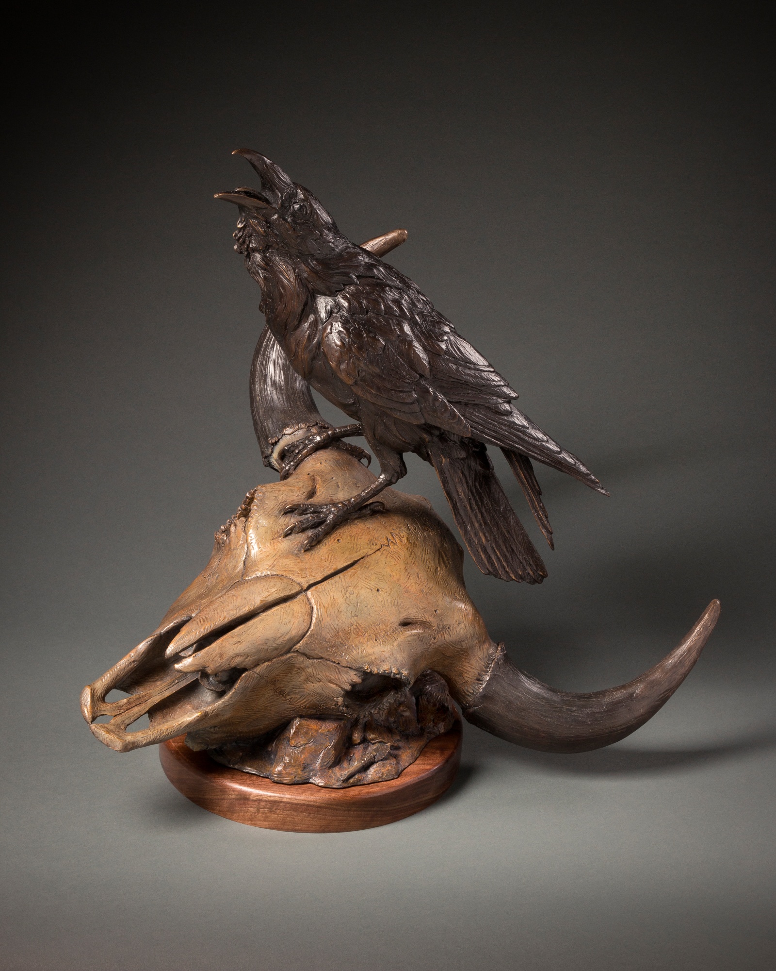 In this piece, we see the Raven perched on a buffalo skull to warn us of what can happen when we only think of ourselves. During the time of the American/Indian war, the buffalo was the innocents that were caught in the middle. As the troops were ordered to kill off the herds to get the ultimate submission and accept the chosen destination of what is now calls the reservations. As a result, we now only see very few buffalo which used to roam o plenty throughout North America. Such a waste.